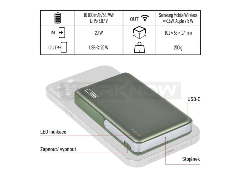 Powerbanka EMOS WI 1031, 10 000 mAh, 20 W+Wireless, army-green