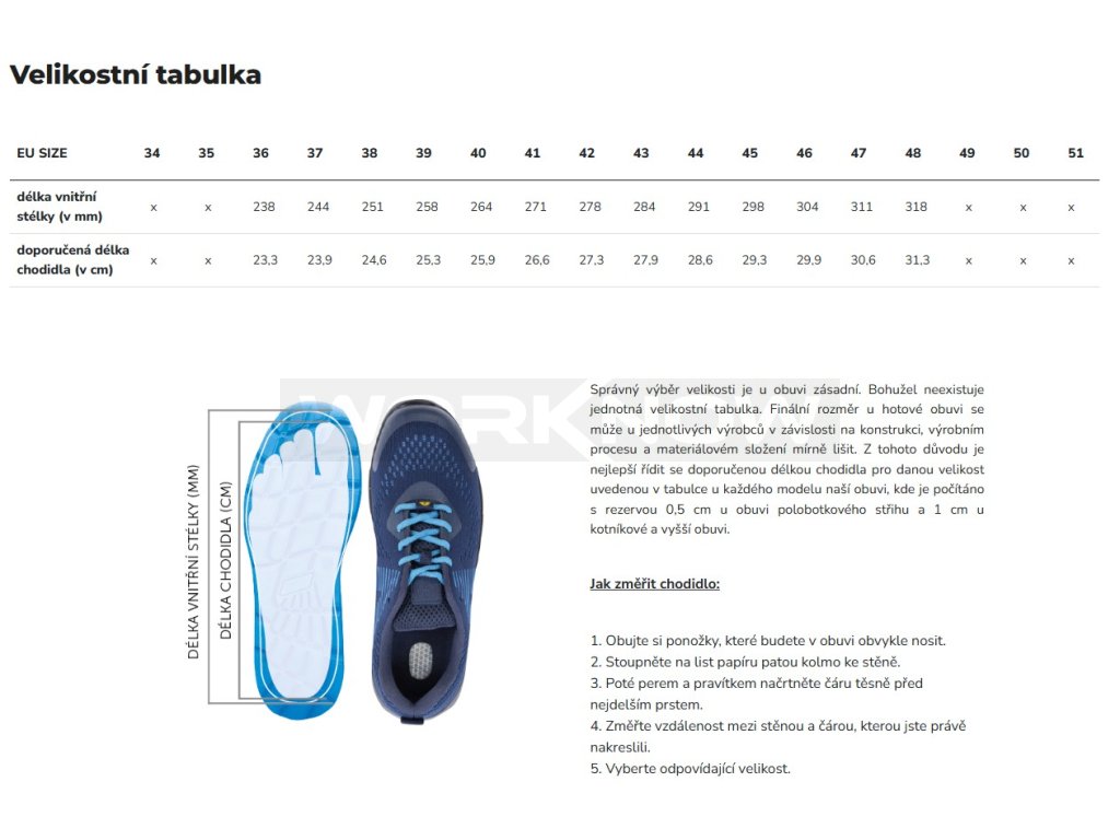 Správný výběr velikosti je u obuvi zásadní. Bohužel neexistuje jednotná velikostní tabulka. Finální rozměr u hotové obuvi se může u jednotlivých výrobců v závislosti na konstrukci, výrobním procesu a materiálovém složení mírně lišit. Z tohoto důvodu je nejlepší řídit se doporučenou délkou chodidla pro danou velikost uvedenou v tabulce u každého modelu naší obuvi, kde je počítáno s rezervou 0,5 cm u obuvi polobotkového střihu a 1 cm u kotníkové a vyšší obuvi.