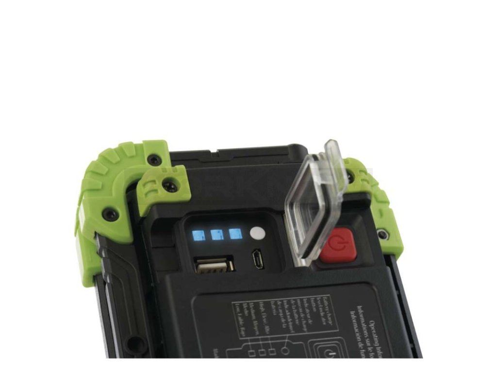 Na jeho zadní straně najdete malé odklápěcí okénko, pod kterým jsou bezpečně ukryté 2 USB porty. Pomocí toho menšího (USB-B) reflektor dobíjíte, ten větší (USB-A) vám naopak umožňuje nastřádanou energii dostat zase ven – třeba si z něj v případě nouze nabít mobil. O stavu nabíjení i zbývajícím množství energie v reflektoru vás průběžně informují 4 barevné LED diody.
