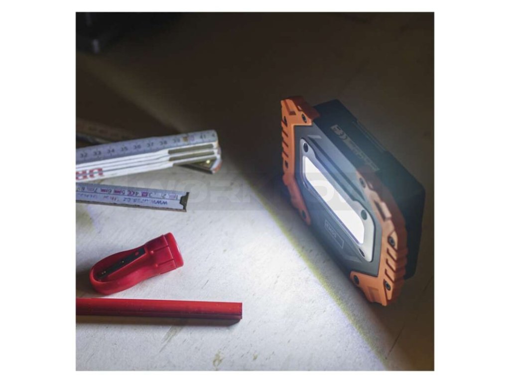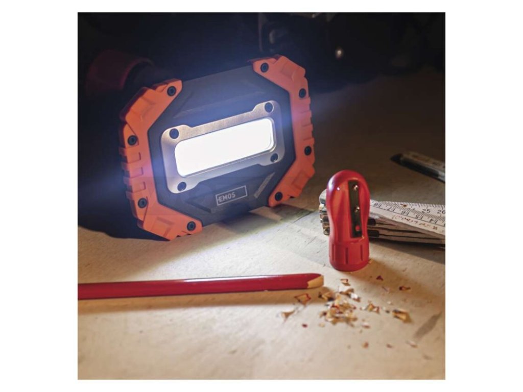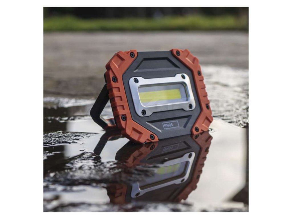 Svítilnu můžete použít při práci nejen doma nebo v garáži. Je připravena i na ztížené podmínky venkovního prostředí. O lepší odolnosti svítilny vůči vodě vypovídá stupeň krytí IP43. Nemusíte se tak bát položit ji do orosené trávy nebo slabého deštíku. Pogumovaný povrch ji ochrání proti poškození způsobené pádem a zároveň zpříjemňuje úchop rukojeti, kterou si můžete nastavit dle libosti.