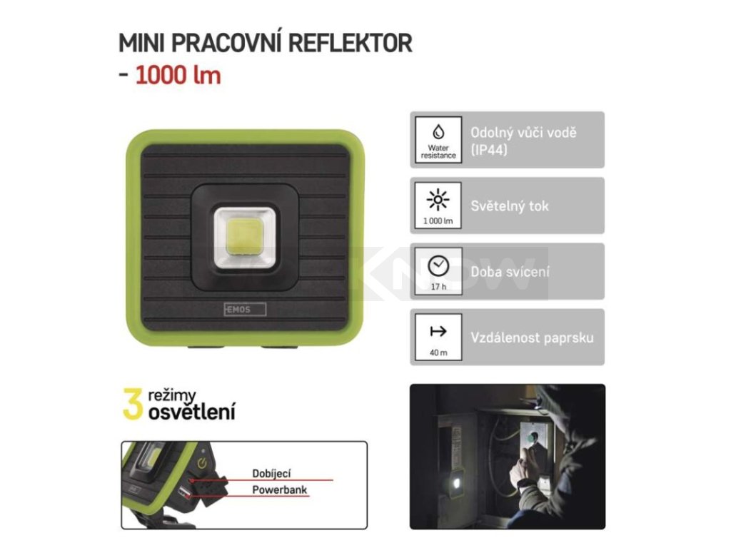 Pak pro vás ideálním řešením nabíjecí pracovní reflektor EMOS P4539 vybavený COB LED čipem se světelným tokem až 1 000 lm, který navíc disponuje třemi režimy svícení. To vše je zabaleno do miniaturního těla o rozměrech pouhých 104 × 94 × 39 mm.