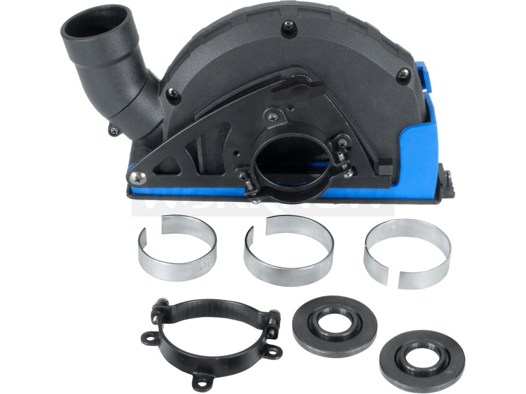 - za pomocí dvou nastavitelných fixačních objímek(límců) s odlišnými průměry v kombinaci s vymezovacími vložkami a vystřeďovacími podložkami lze tento odsávací kryt nainstalovat na všechny běžné typy 125mm úhlových brusek