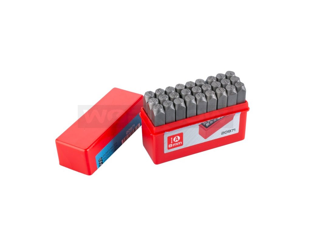 Ruční raznice - písmena abecedy, kvalitní uhlíková ocel - pevnost do 800 N/mm2, zakalené hroty - vysoká tvrdost, rozměry : výška písmen - 8 mm, balení: plastový box.