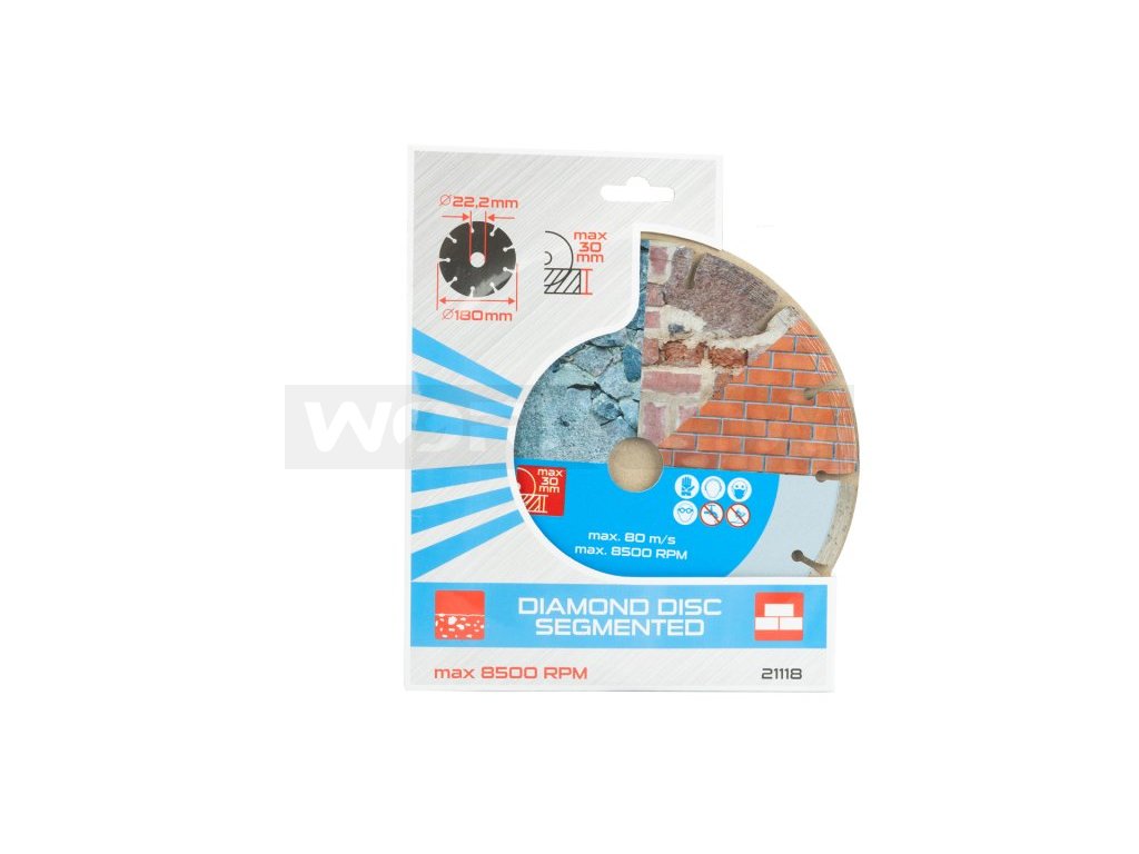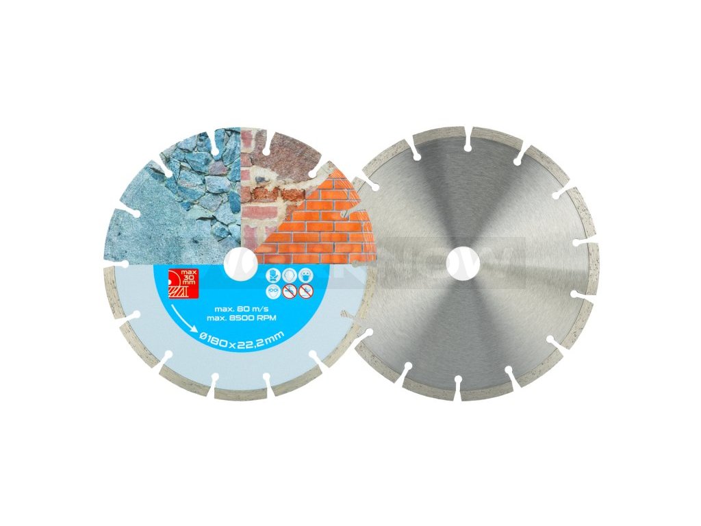 Diamantový kotouč DIAMANT, provedení : SEGMENTOVÝ, kvalitní materiály i zpracování - vysoce pevné uchycení diamantových segmentů k nosnému disku kotouče, vysoký obsah diamantového prachu v segmentech, použití : pro suché řezání betonu, cihel, zdiva, kamene, ... , balení : blistr s eurootvorem, přiložen redukční kroužek z 22,2 na 20 mm, rozměry : uvedeny v názvu výrobku.Doplňkové parametry