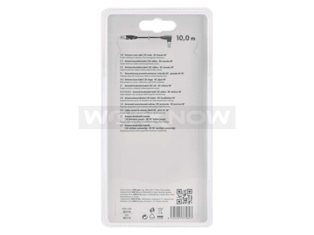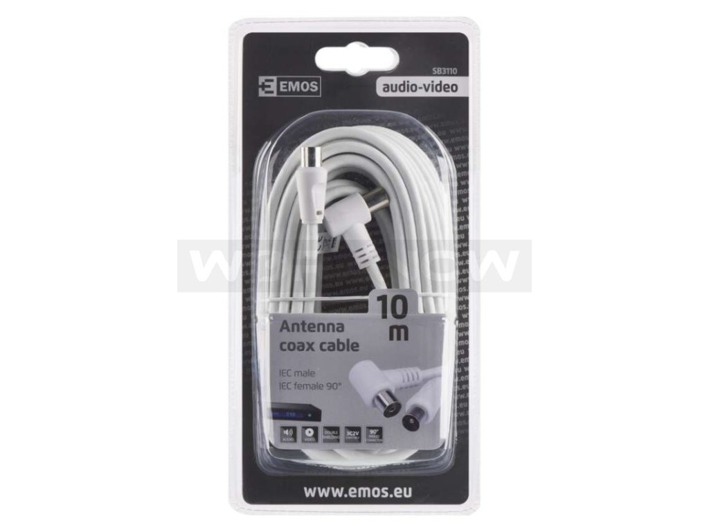 Anténní koaxiální kabel s vidlicí a zásuvkou IEC. Kabel má úhlový konektor (90°). Kabel má dvojité stínění pro redukci elektromagnetického rušení. Délka kabelu je 10 m. Koaxiální kabel je vhodný pro SAT, DVB-T, ANT, DECODER, FLAT TV a TV.