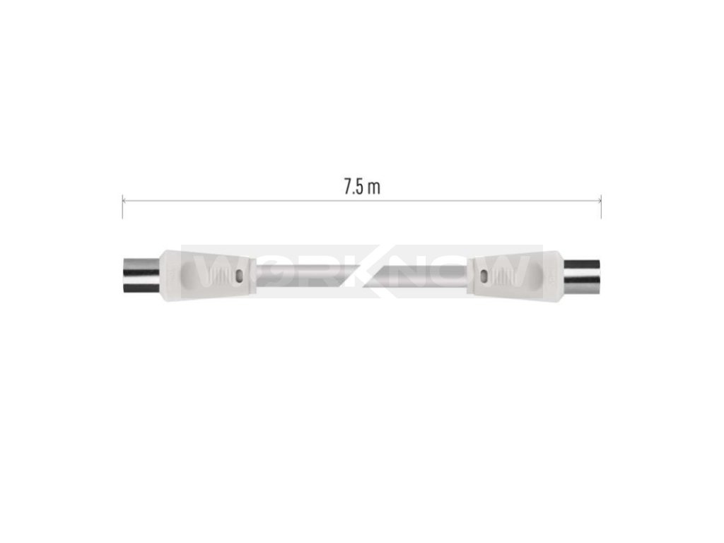 Anténní koaxiální kabel s vidlicí a zásuvkou IEC. Kabel má dvojité stínění pro redukci elektromagnetického rušení. Délka kabelu je 7,5 m. Koaxiální kabel je vhodný pro SAT, DVB-T, ANT, DECODER, FLAT TV a TV.