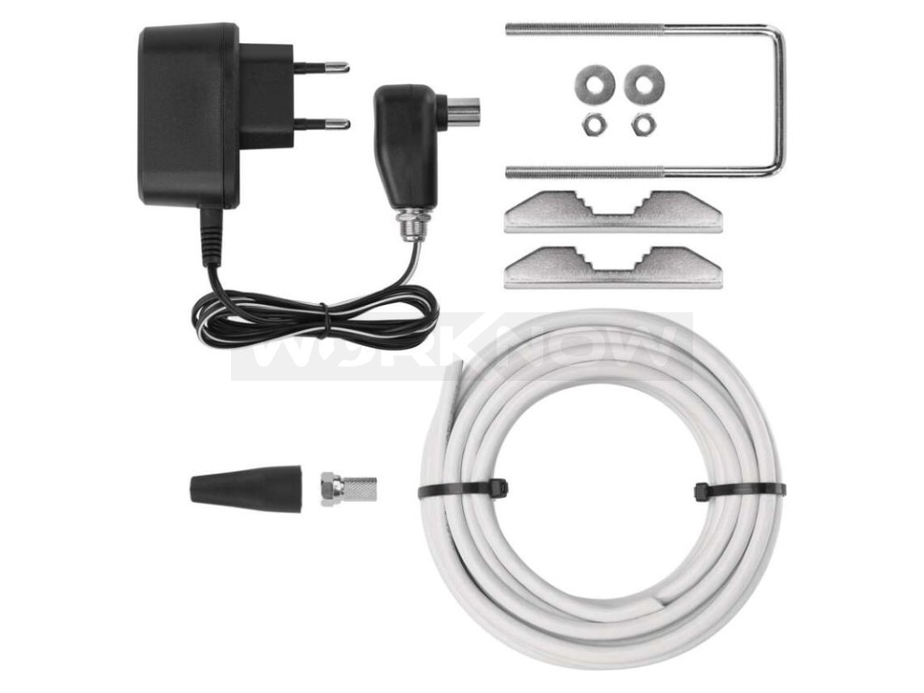 Anténa FISH–V700 obsahuje v balení vše, co budete potřebovat k její montáži na anténní stožár, držák nebo balkonové zábradlí. Montáž je velmi jednoduchá bez nutnosti použití nářadí.