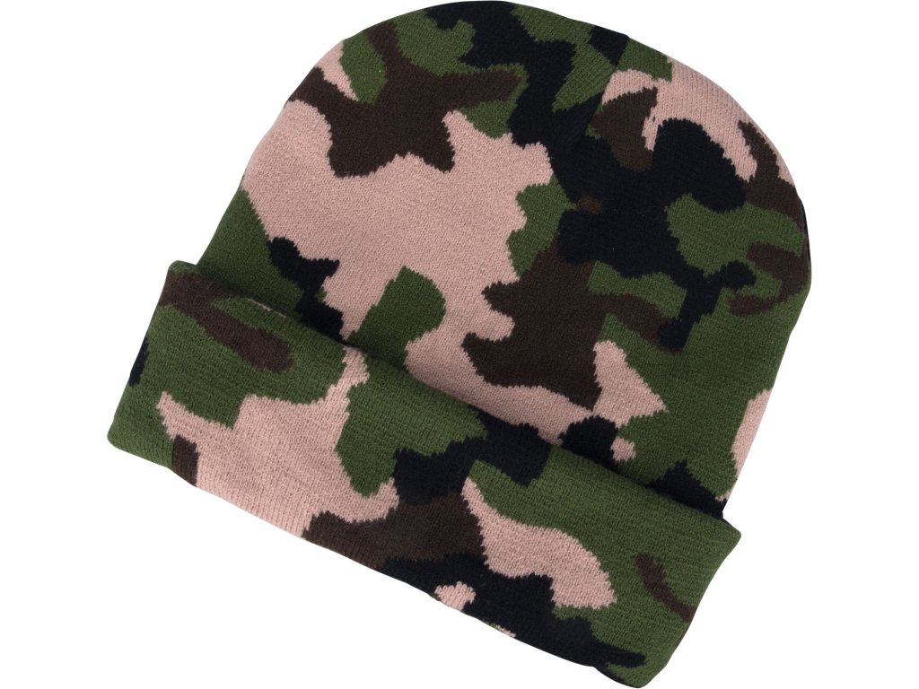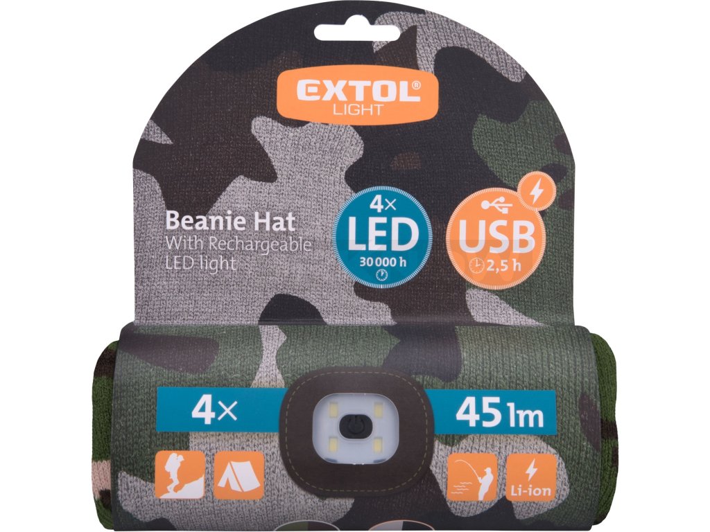 Čepice s čelovkou 4x45lm, USB nabíjení, maskovací, univerzální velikost, 100% acryl