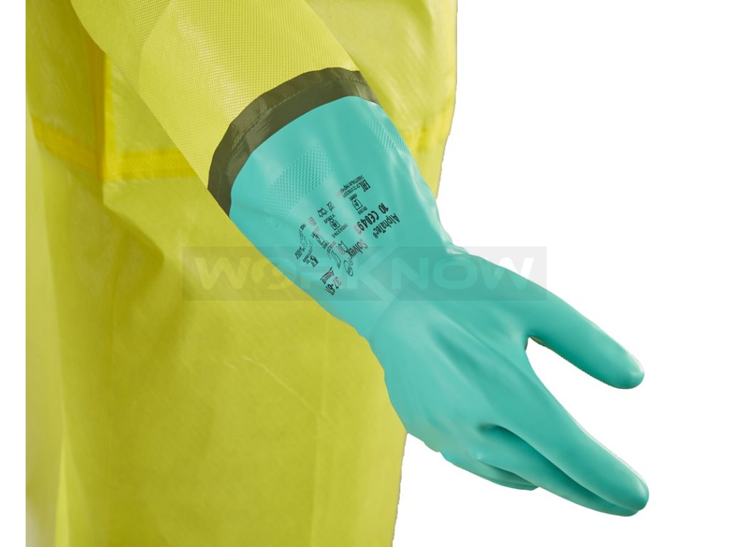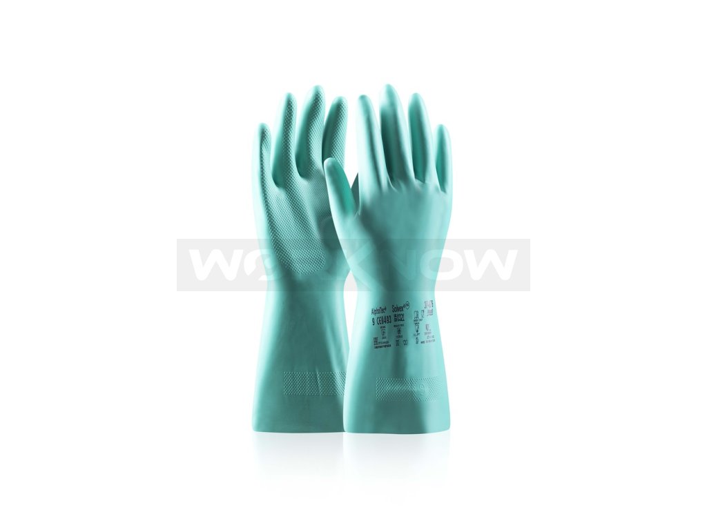 Ochranné rukavice CE CAT. III s výbornými ochrannými vlastnostmi nitrilu, které jsou vhodné do olejů a pro manipulaci s chemikáliemi. Tyto rukavice jsou vysoce odolné a ideální pro většinu profesionálních čistících aplikací. Mají povrchovou úpravu pro snadnější a bezpečnější úchop a jsou k dispozici v balení po 12 kusech a po 144 kusech v kartonu. Tloušťka dlaně je 0,38 mm +- 0,05 mm a délka 330 +-10 mm. Rukavice mají vnější stranu s obrácenými kosočtverci a vnitřní stranu s velurovou úpravou. Splňují normy EN 388 3101, EN 374-2, EN 374-3 AJK a jsou zelené barvy. Jsou k dispozici v velikostech 6-10.