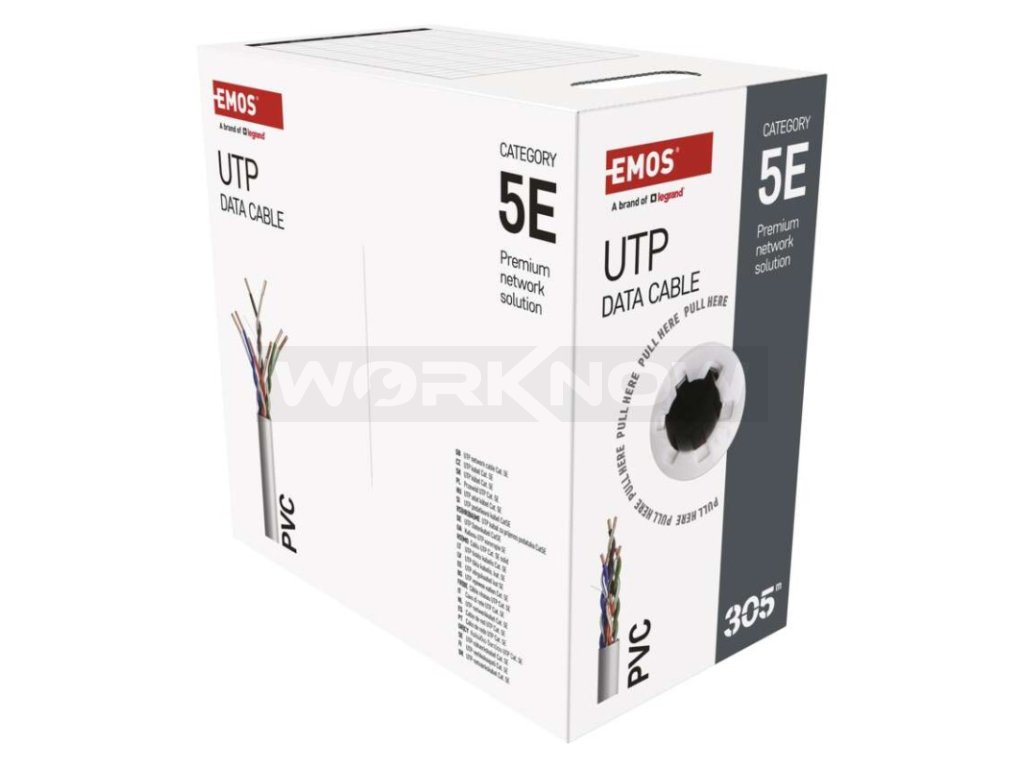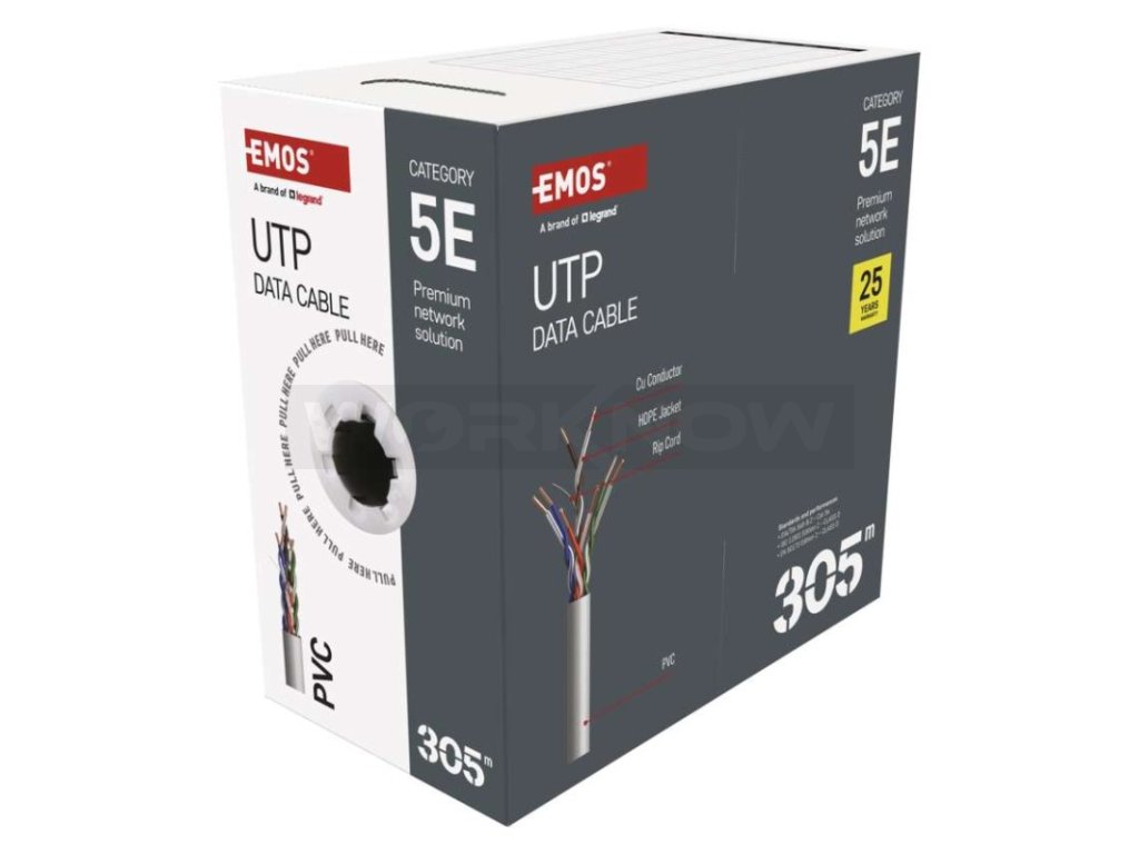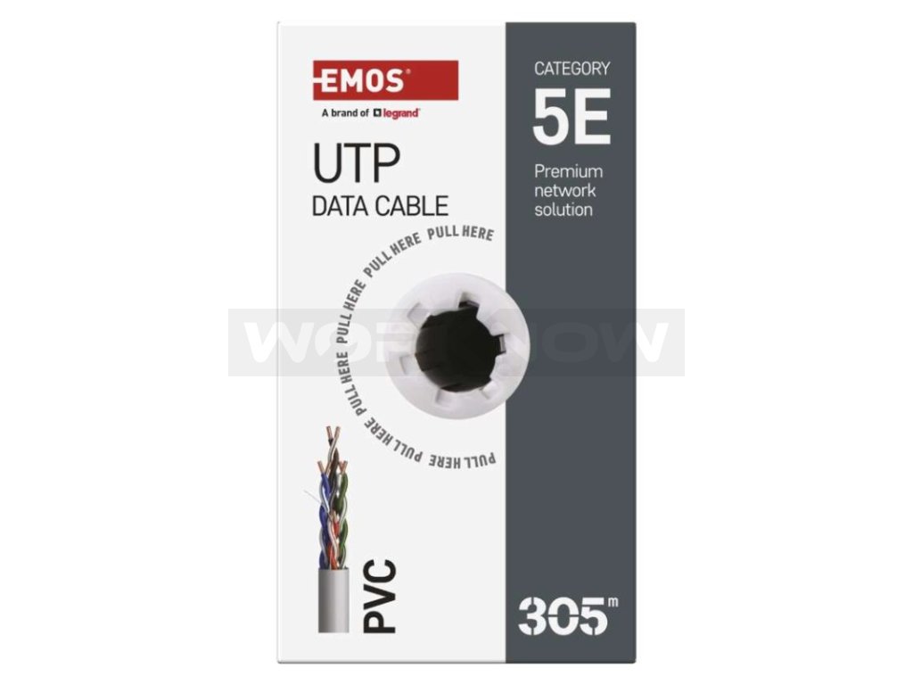 Nestíněný horizontální kabel nejvyšší kvality kategorie CAT5E s PVC pláštěm. Jádra vodičů vyrobeny z nerecyklované mědi. Kabel splňuje požadavky směrnice CPR o stavebních výrobcích.