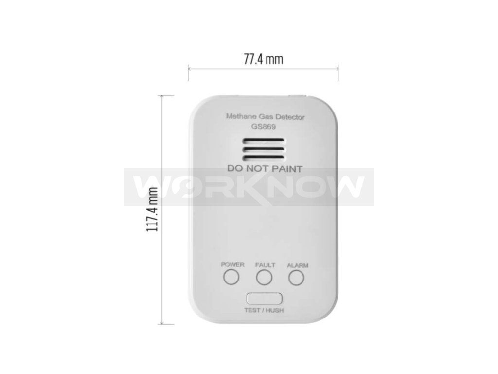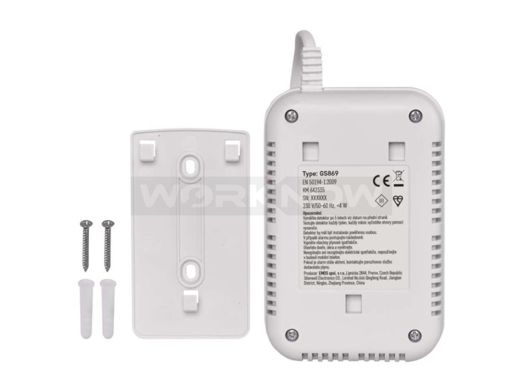 Detektor plynu je určený pro montáž na zeď nebo pro volné umístění kdekoliv v místnosti. Pro jednoduché zavěšení slouží montážní deska, kterou pomocí vrutů připevníte na zeď. Funkční detektor poté jednoduše nasadíte na montážní desku na k tomu určené fixační výstupky. Váš detektor plynu GS869 je poté plně připraven k použití.