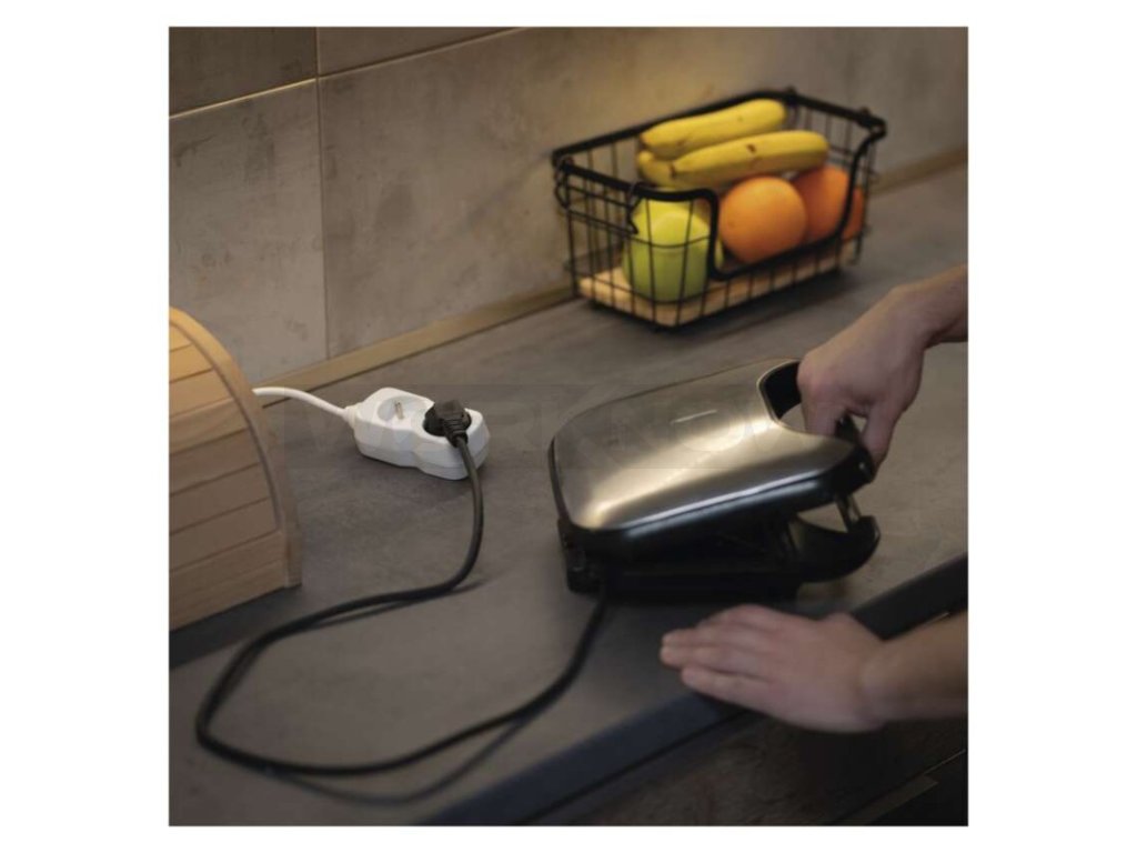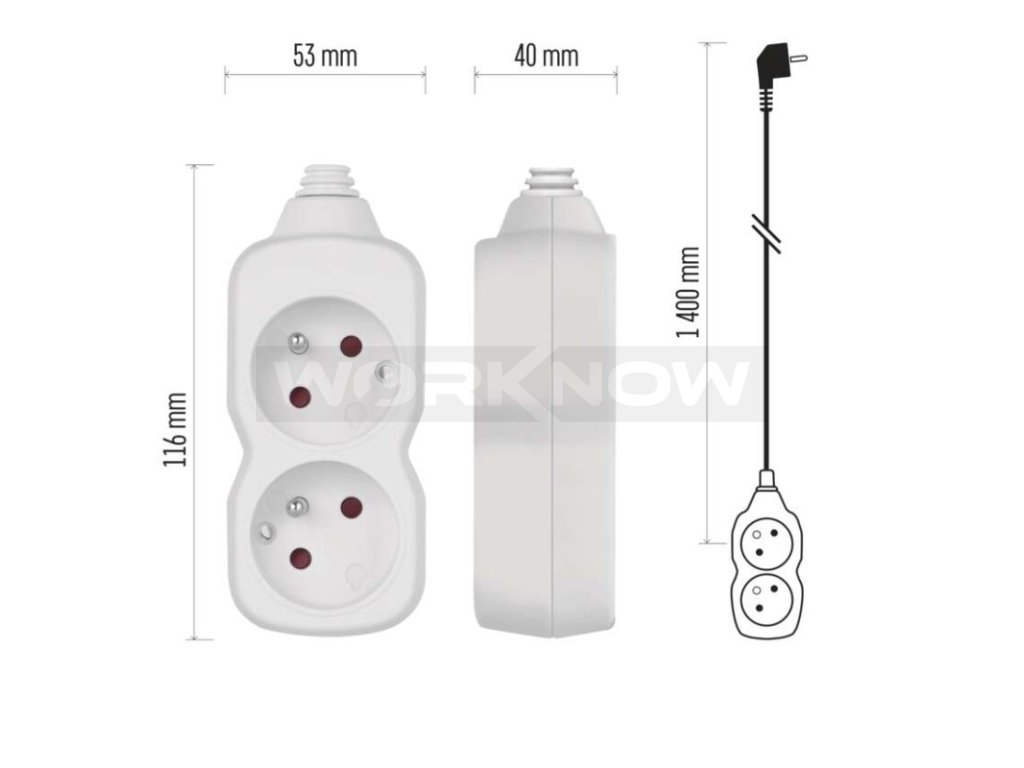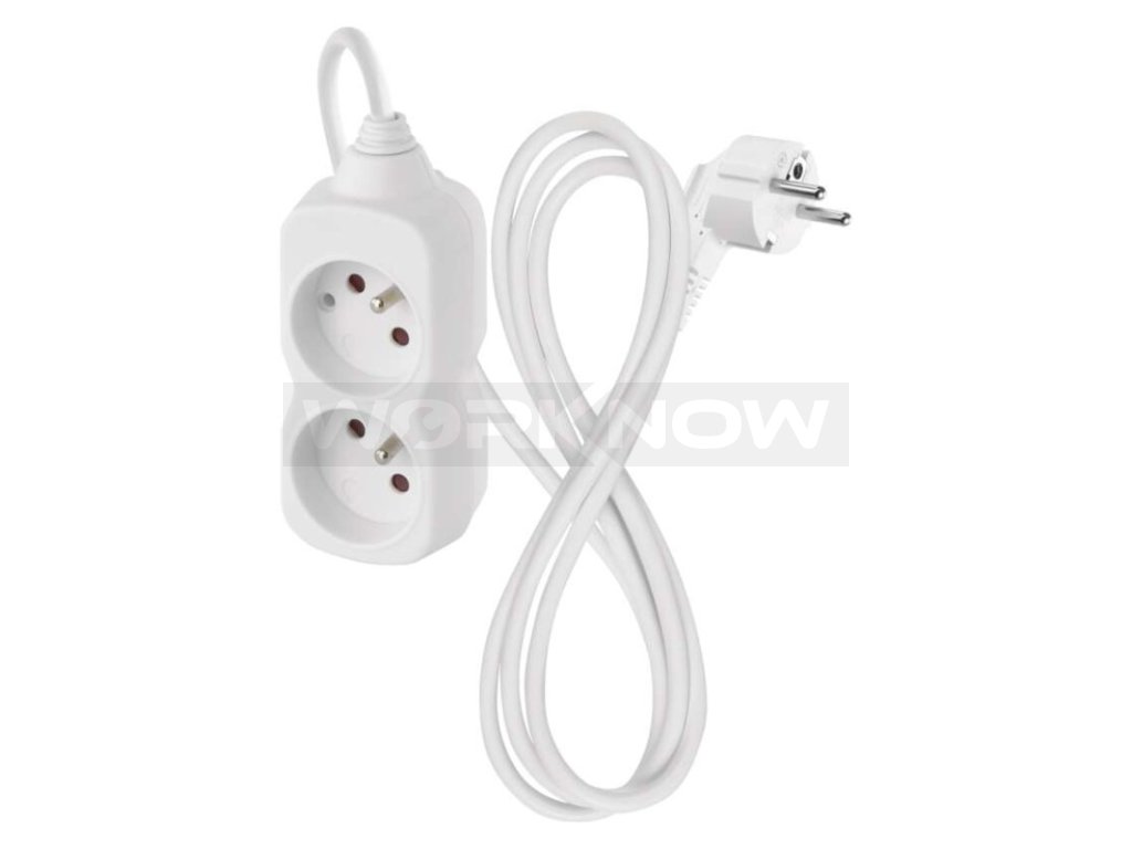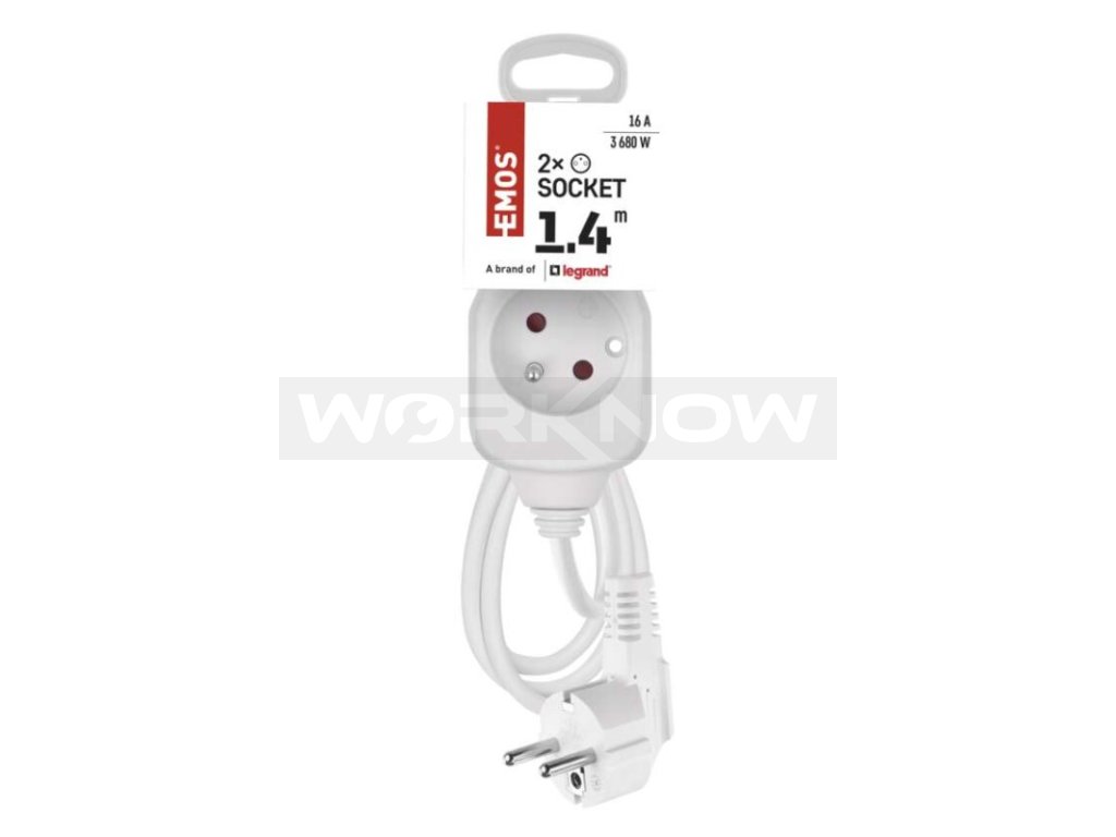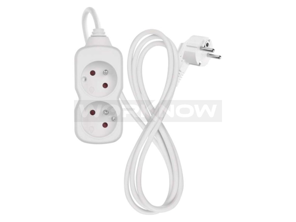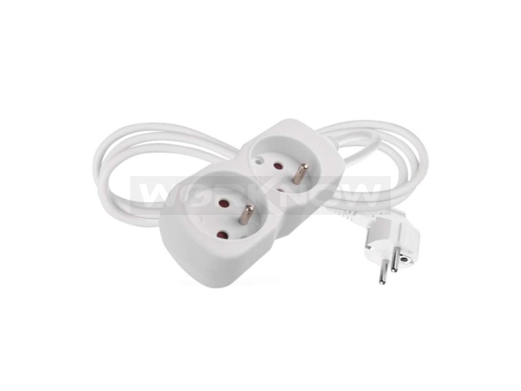Bílý prodlužovací přívod, 2 zásuvky s dětskými clonkami a délkou 1,4 m. Průřezem vodiče 1 mm2. Vhodný pro maximální zátěž 16 A max.Při montáži na stěnu je nutné použít vrut se zápustnou hlavou PZ max. průměr 2,5–3 mm, délka 30–40 mm. V případě použití jiného průměru hrozí poškození plastové části otvoru. Pokud dojde k poškození plastové části otvoru, prodlužovací přívod nepoužívejte.