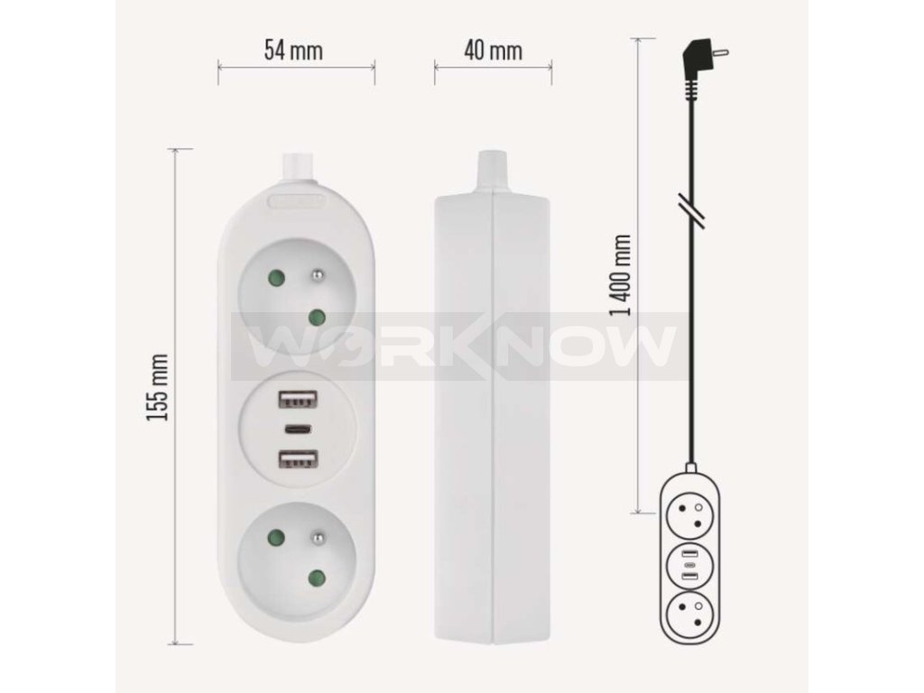 Prodlužovací kabel 1,4 m / 2 zásuvky+2×USB-A+1×USB-C / bílý / PVC / 1,5 mm2