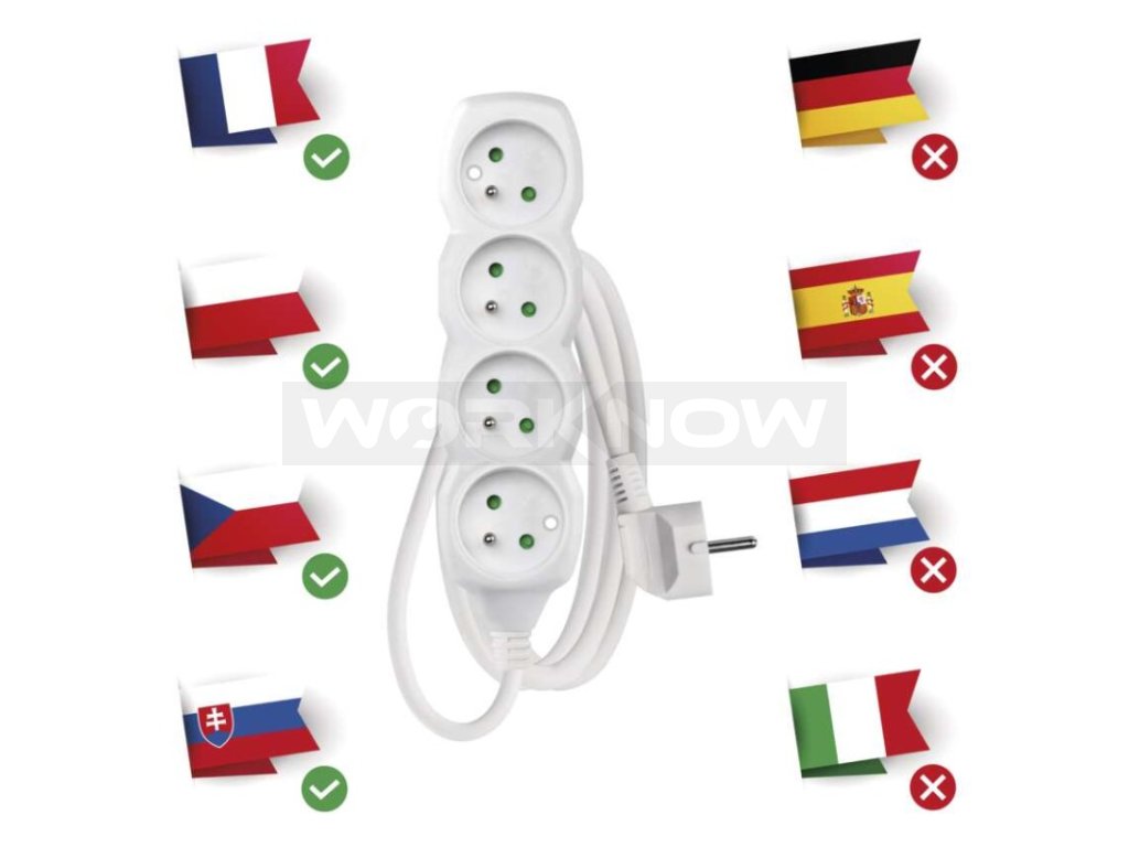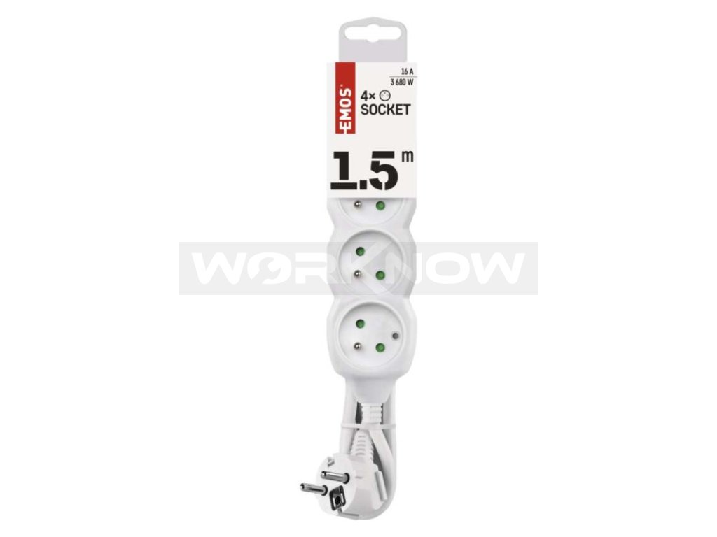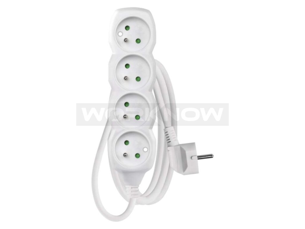 Bílý prodlužovací přívod, 4 zásuvka s délkou 1,5 m a průřezem vodiče 1 mm2. Vhodný pro maximální zátěž 10 A max.