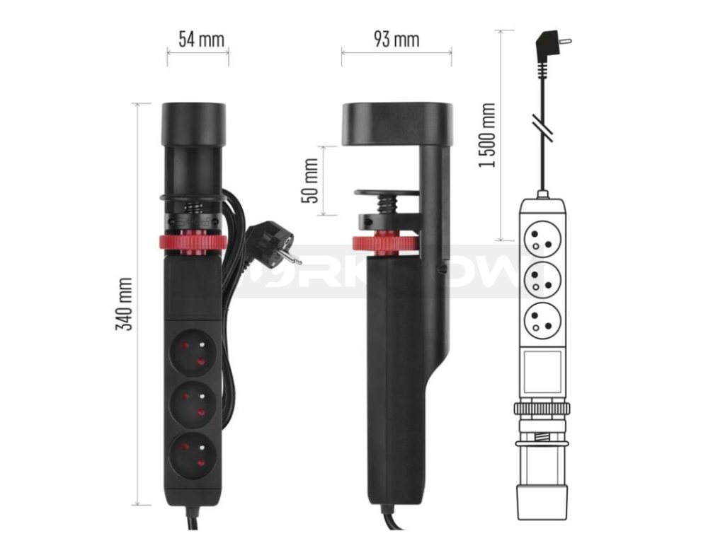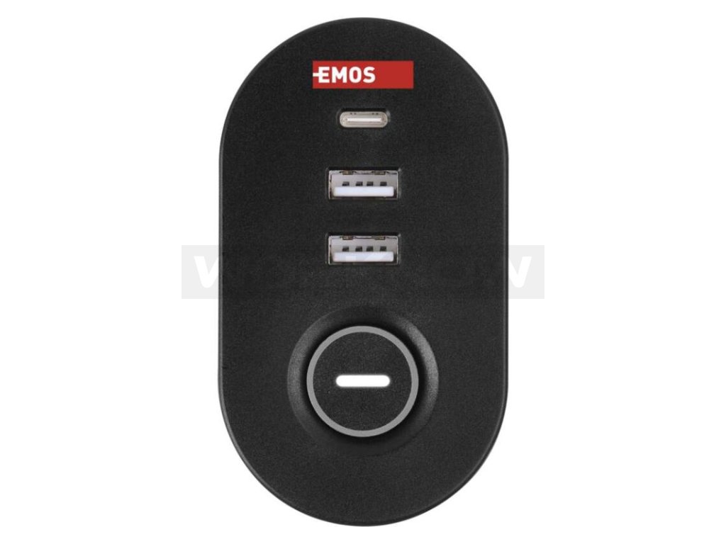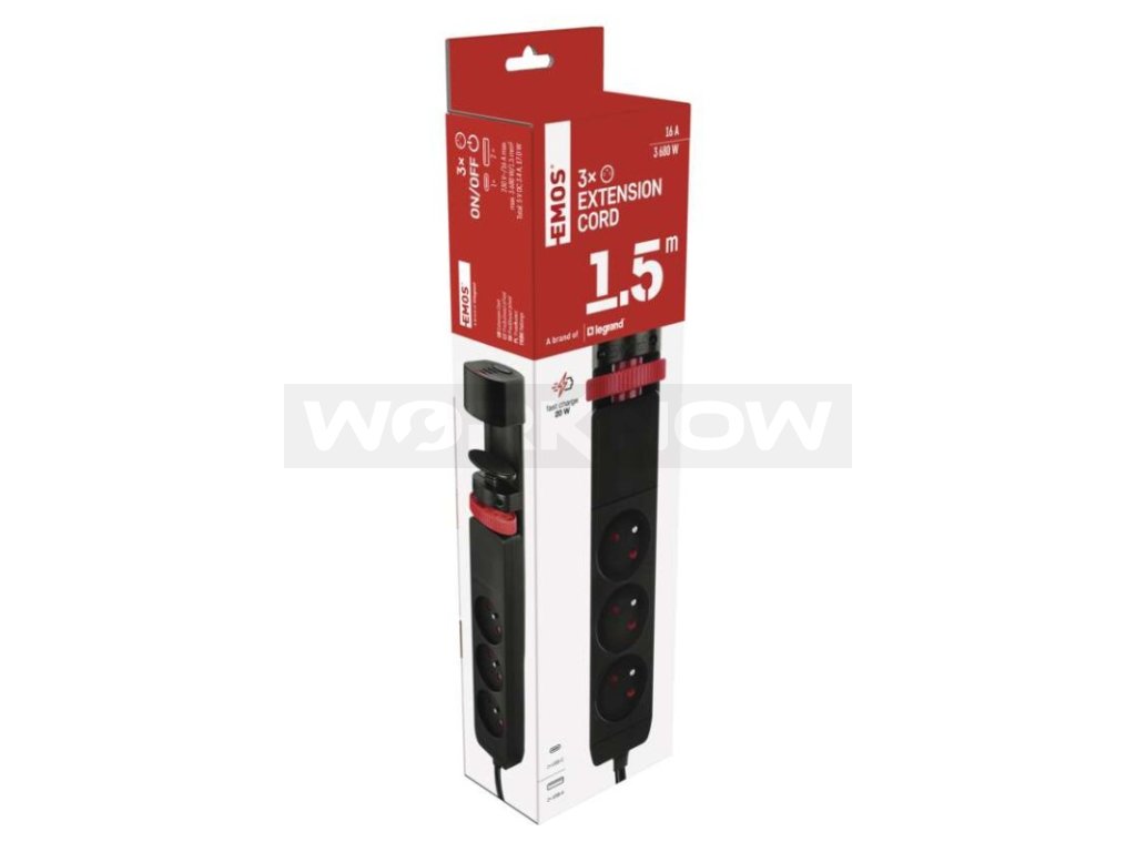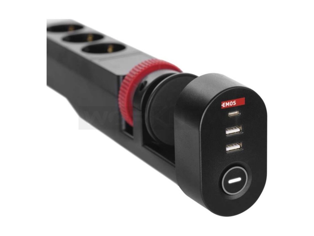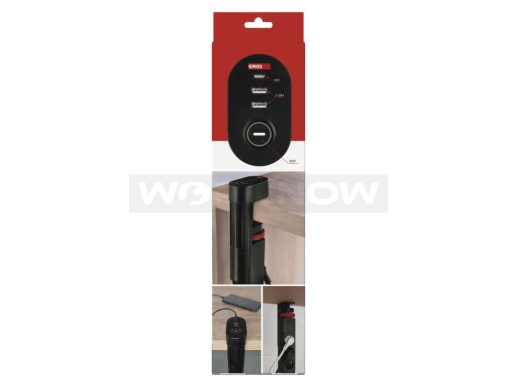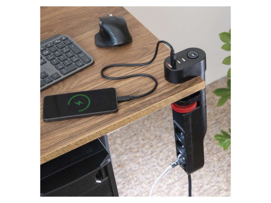 Prodlužovací přívod s vypínačem. Snadné upevnění na pracovní stůl max. 50 mm. 250V~/16A max. 3 zásuvky s dětskými clonkami. USB 2×A+C 3,4 A, 17 W max. Délka přívodního kabelu 1,5 m. Vodič H05VV-F3G 1,5mm2.