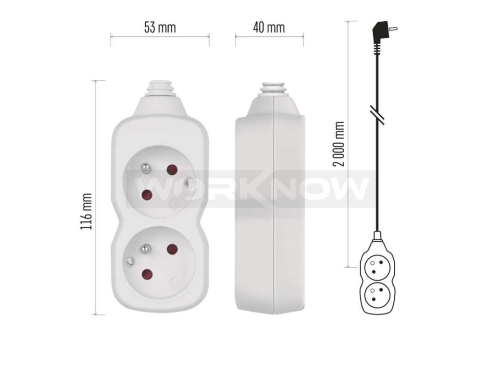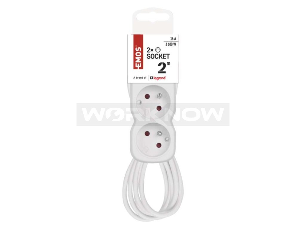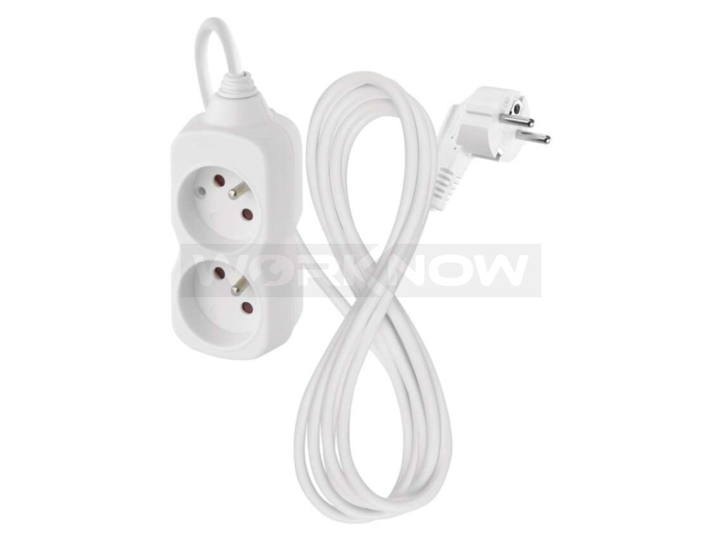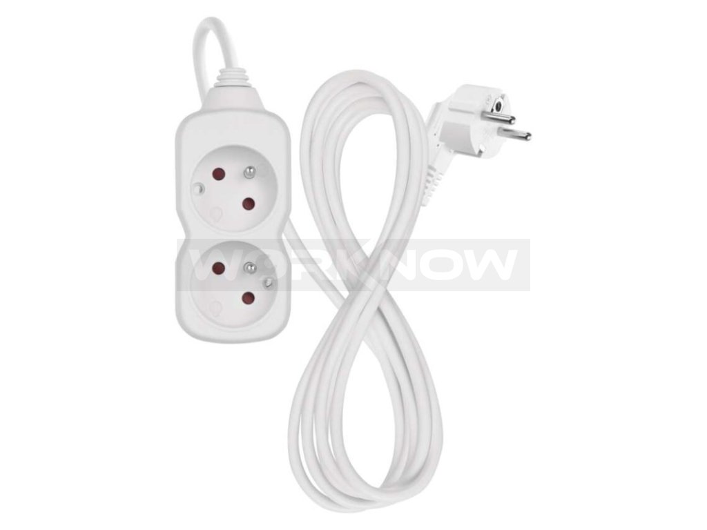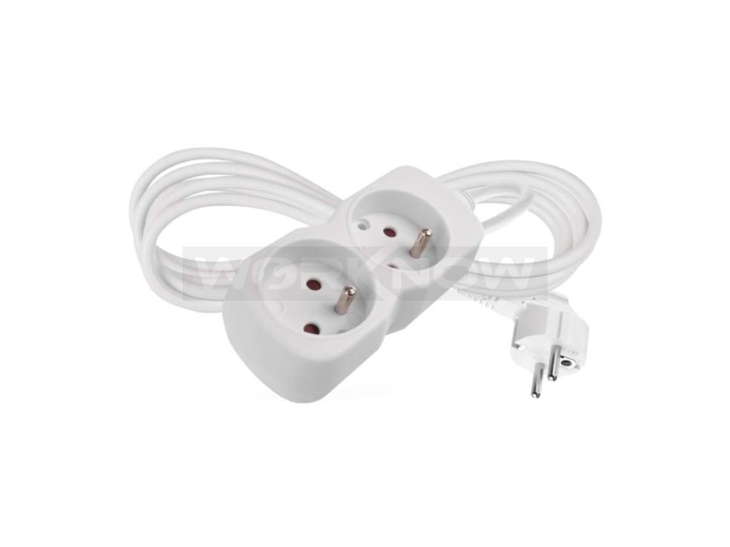 Bílý prodlužovací přívod, 2 zásuvky s dětskými clonkami a délkou 2 m. Průřezem vodiče 1 mm2. Vhodný pro maximální zátěž 16 A max.Při montáži na stěnu je nutné použít vrut se zápustnou hlavou PZ max. průměr 2,5–3 mm, délka 30–40 mm. V případě použití jiného průměru hrozí poškození plastové části otvoru. Pokud dojde k poškození plastové části otvoru, prodlužovací přívod nepoužívejte.