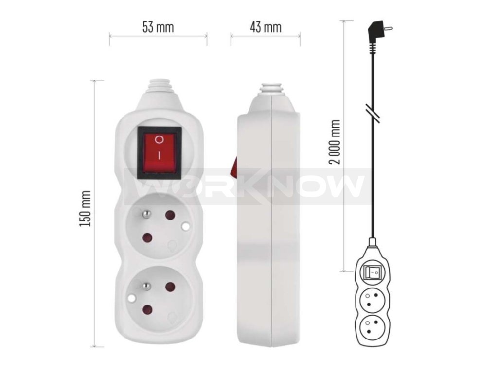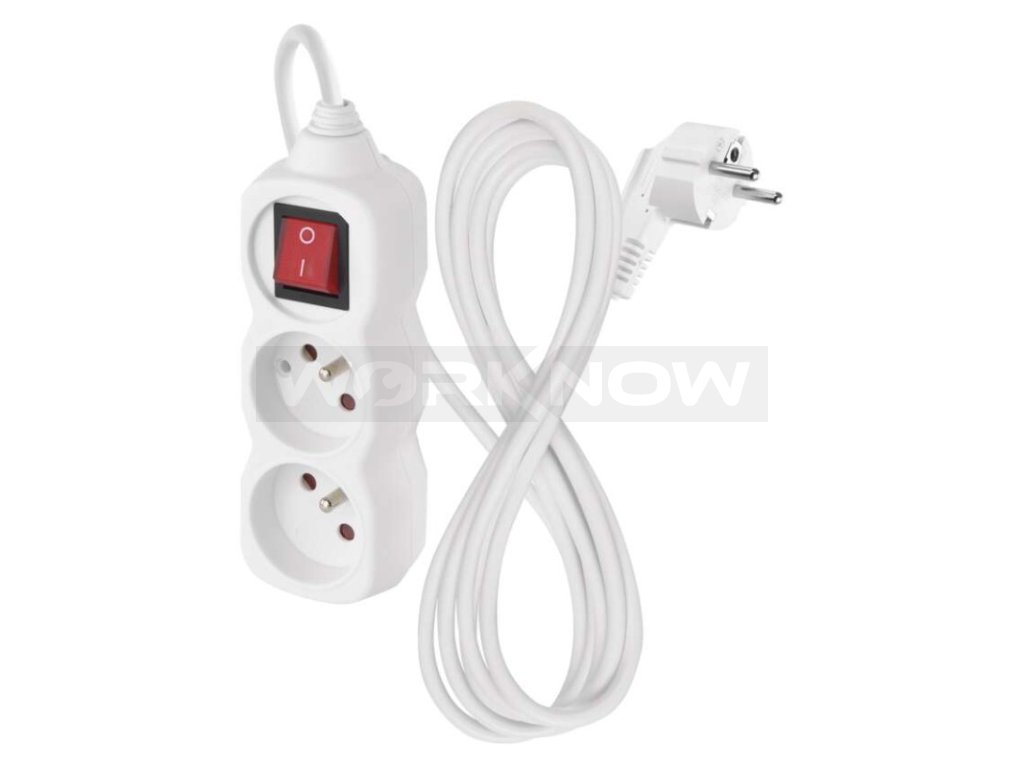 Bílý prodlužovací přívod, 2 zásuvky s dětskými clonkami, vypínačem, délkou 2 m. Průřezem vodiče 1 mm2. Vhodný pro maximální zátěž 16 A max.Při montáži na stěnu je nutné použít vrut se zápustnou hlavou PZ max. průměr 2,5–3 mm, délka 30–40 mm. V případě použití jiného průměru hrozí poškození plastové části otvoru. Pokud dojde k poškození plastové části otvoru, prodlužovací přívod nepoužívejte.