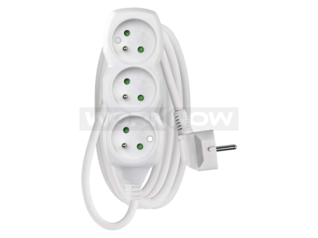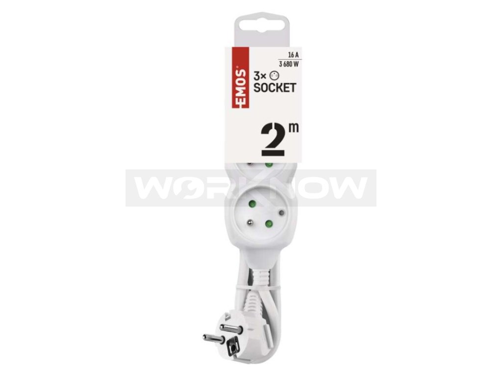 Bílý prodlužovací přívod, 3 zásuvka s délkou 2 m a průřezem vodiče 1 mm2. Vhodný pro maximální zátěž 16 A max.