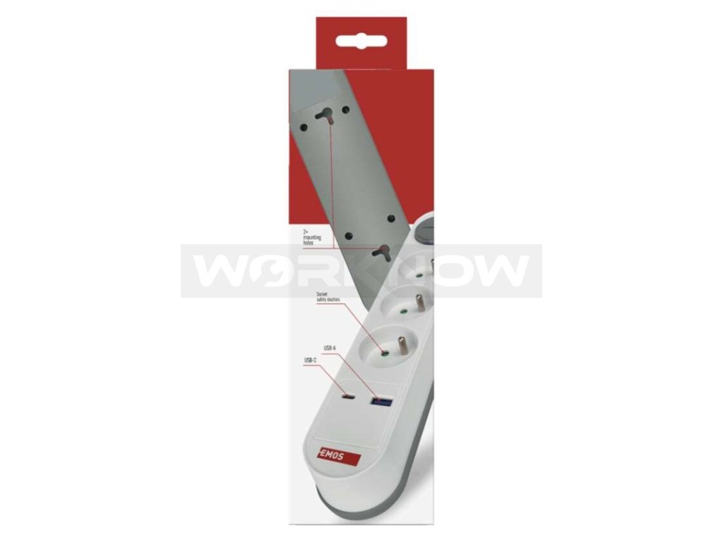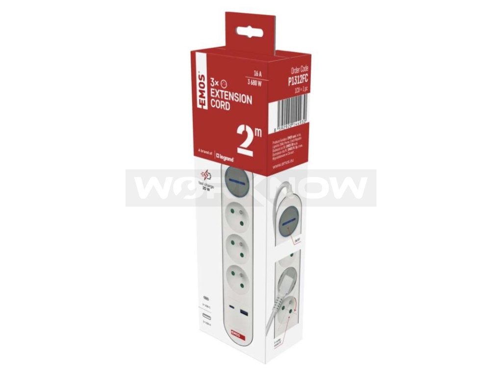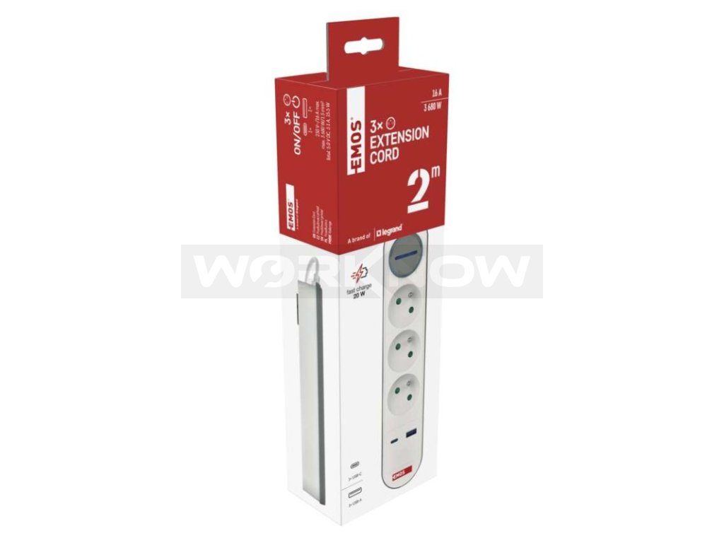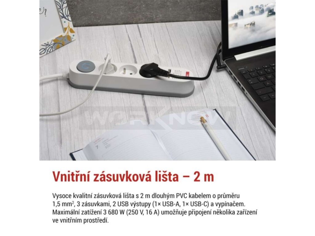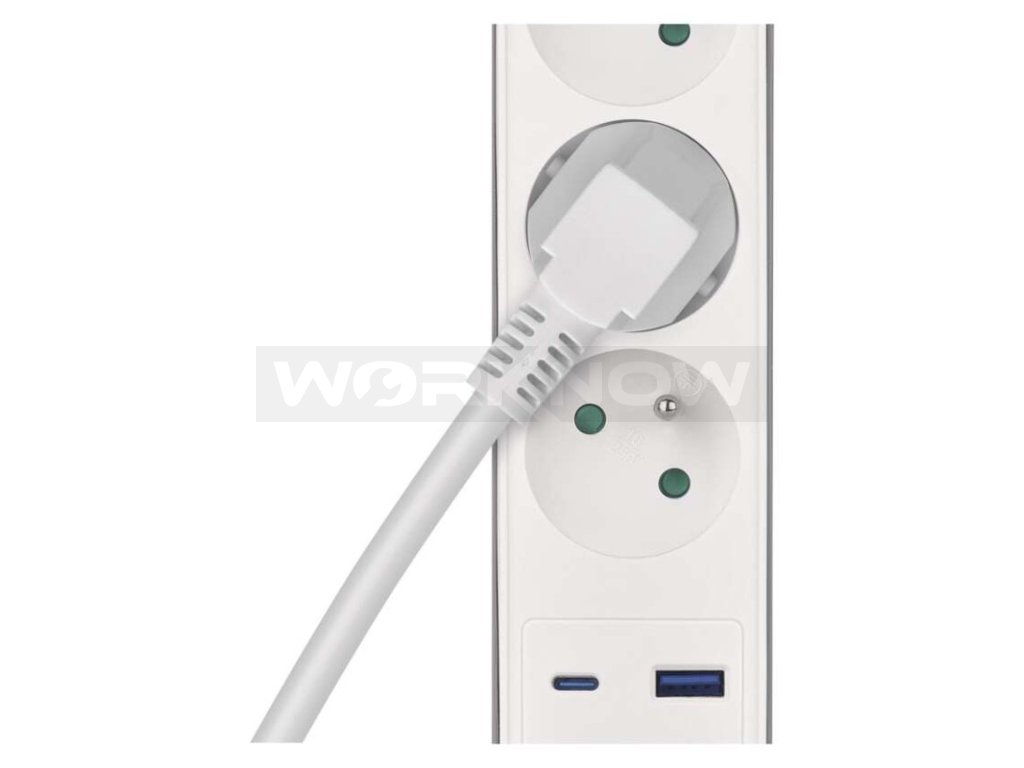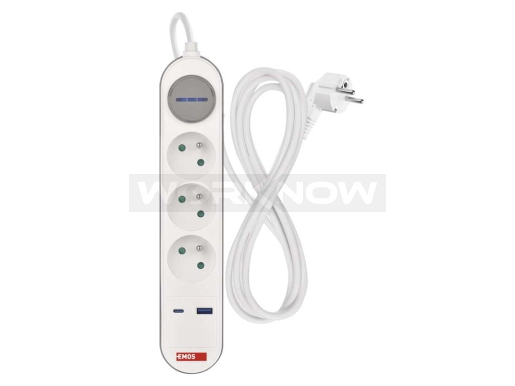 Prodlužovací přívod s vypínačem. 250V~/16A max. 3 zásuvky s dětskými clonkami. USB A+C 3,1 A, 15,5 W max. Délka přívodního kabelu 2 m. Vodič H05VV-F3G 1,5mm2.