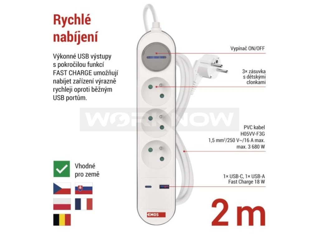 Max. zátěž 3 680 W. USB A: 5V DC 3A/15W, 9V DC 2A/18W, 12V DC 1,5A/18W, USB-C: 5V DC 3A/15W, 9V DC 2,22A/20W, 12V DC 1,67A/20W - fast charging-PD (Power Delivery). Σ(in total) USB A/C: 5,0V DC 3,1A/15,5 W.