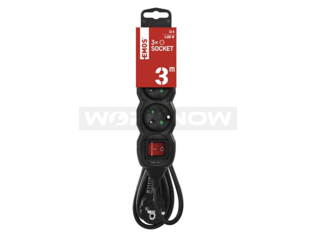 Prodlužovací kabel 3 m / 3 zásuvky / s vypínačem / černý / PVC / 1,5 mm2