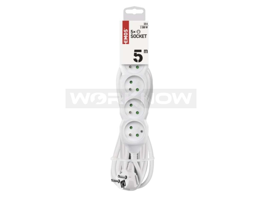 Bílý prodlužovací přívod, 5 zásuvka s délkou 5 m a průřezem vodiče 1 mm2. Vhodný pro maximální zátěž 10 A max.