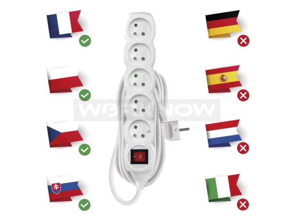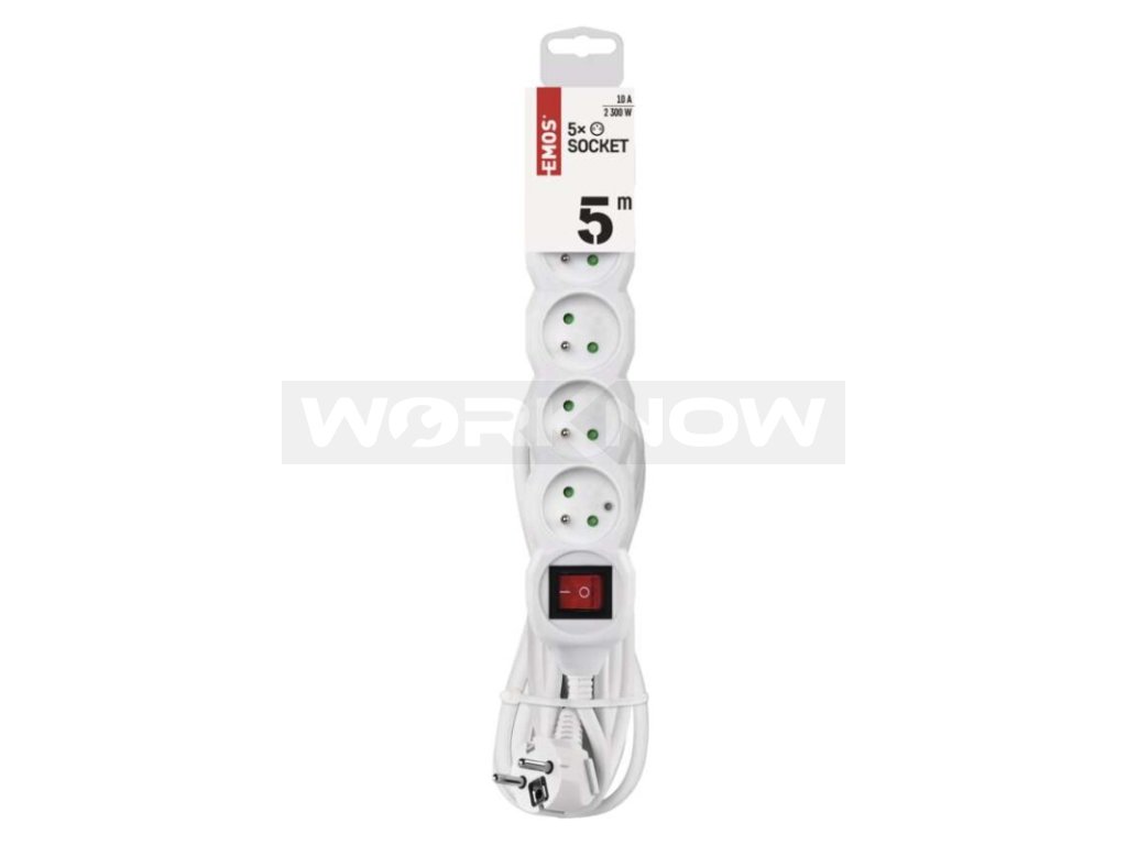 Bílý prodlužovací přívod, 5 zásuvka s vypínačem, délkou 5 m a průřezem vodiče 1 mm2. Vhodný pro maximální zátěž 10 A max.