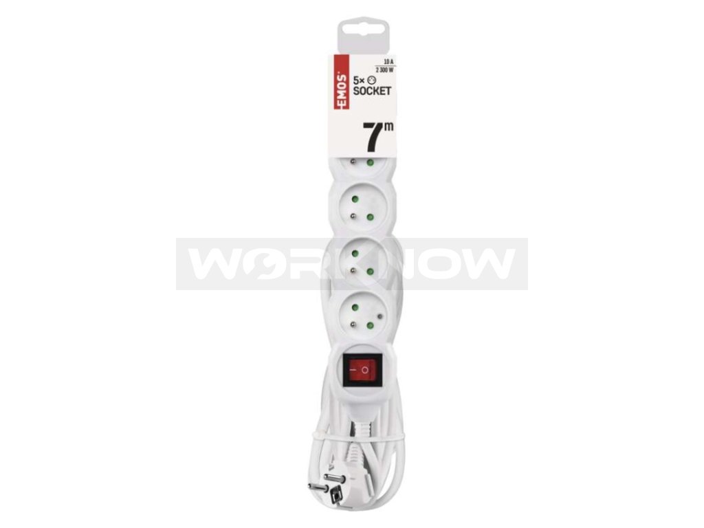 Bílý prodlužovací přívod, 5 zásuvka s vypínačem, délkou 7 m a průřezem vodiče 1 mm2. Vhodný pro maximální zátěž 10 A max.
