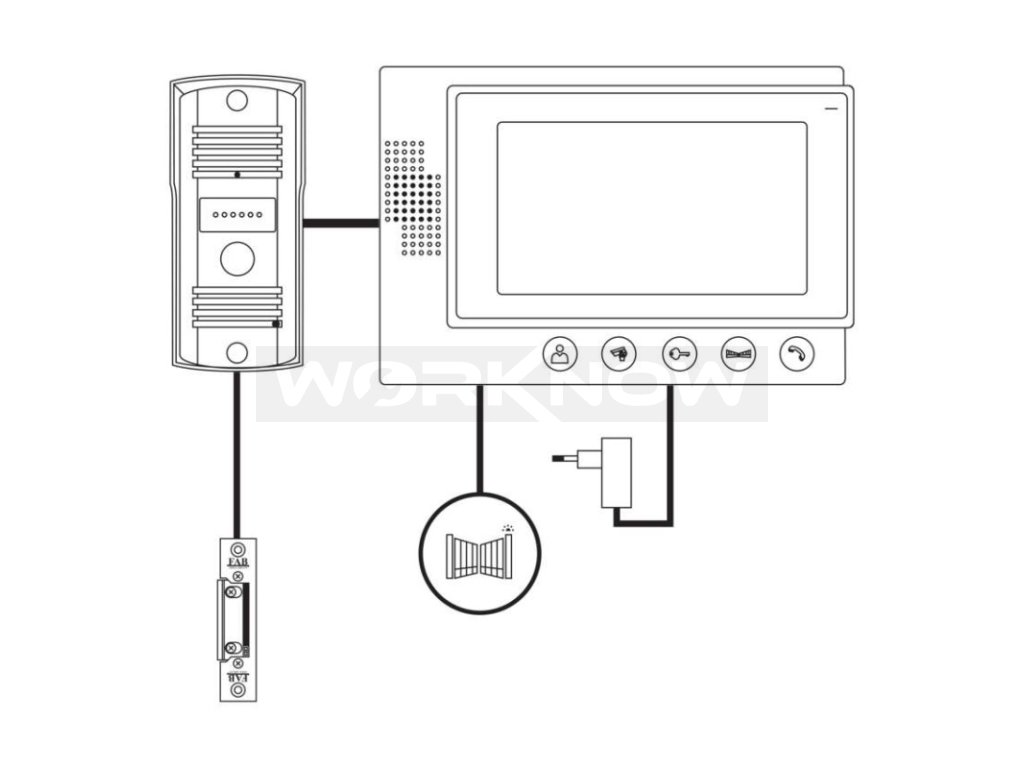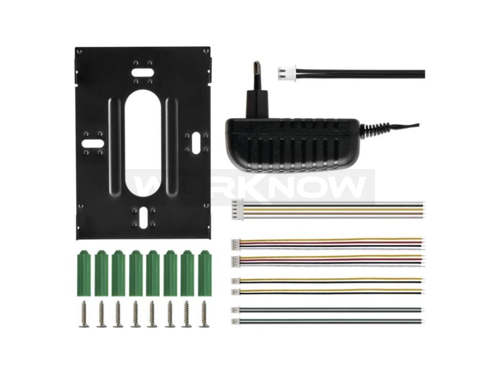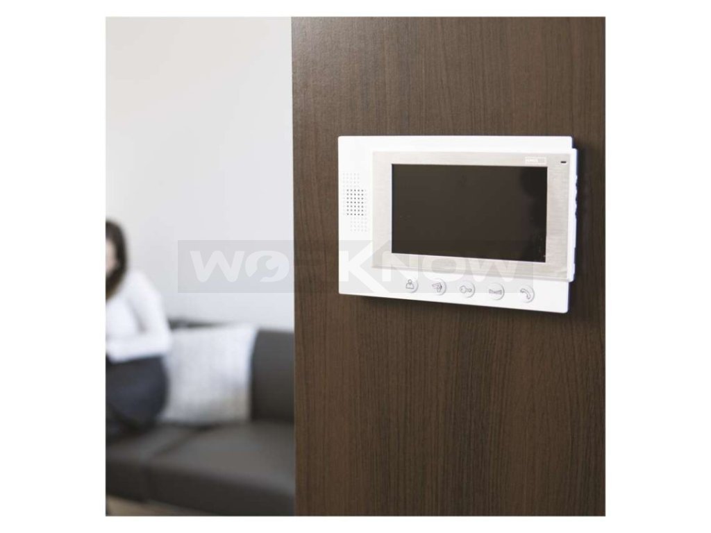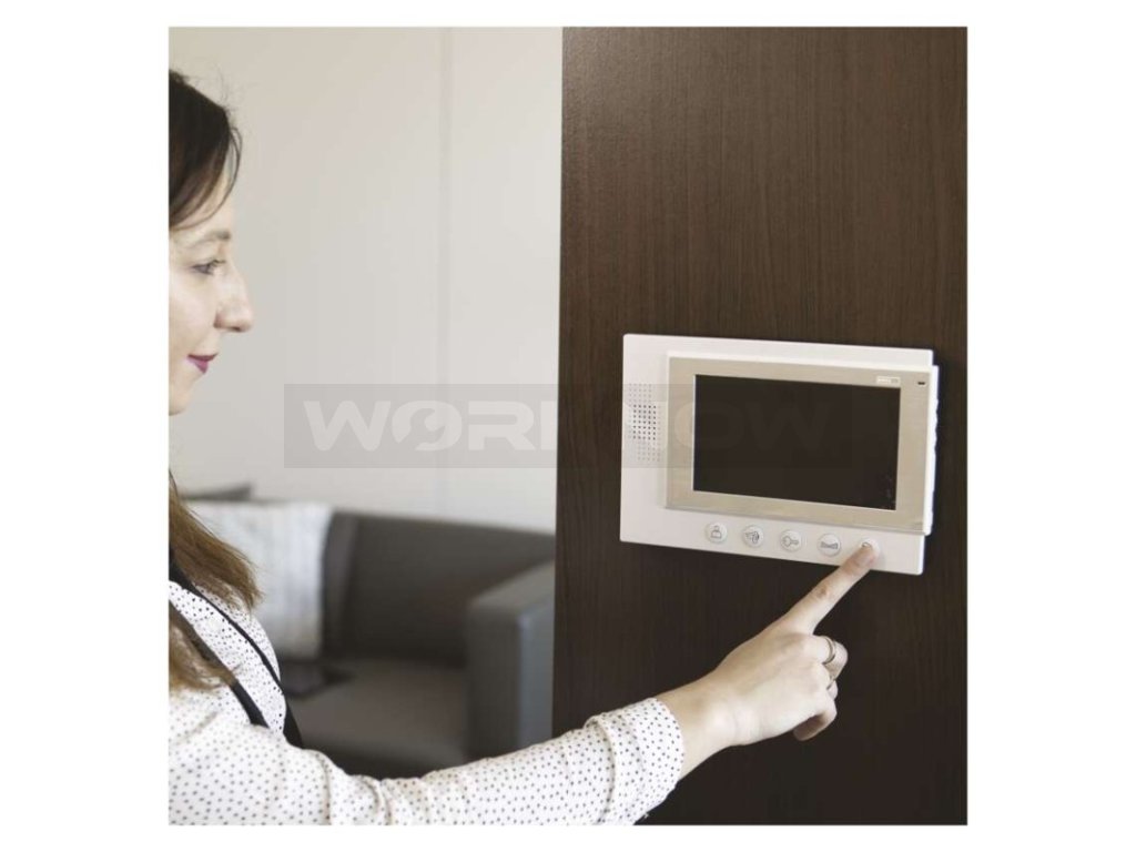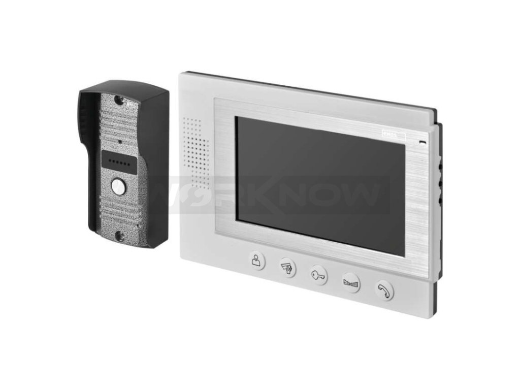 Jednoduchá sada videovrátného. Obraz je zobrazován na velký 7" barevný LCD. Přístroj je napájen pomocí přiloženého adaptéru na 12 V. Zařízení umožňuje obsluhu dveřního zámku a pojezdu brány.