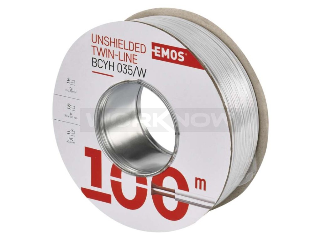 Nestíněná dvojlinka (vodič) s průřezem 2 × 0,15 mm2. Dvojlinka má bílou barvu a plášť z PVC.