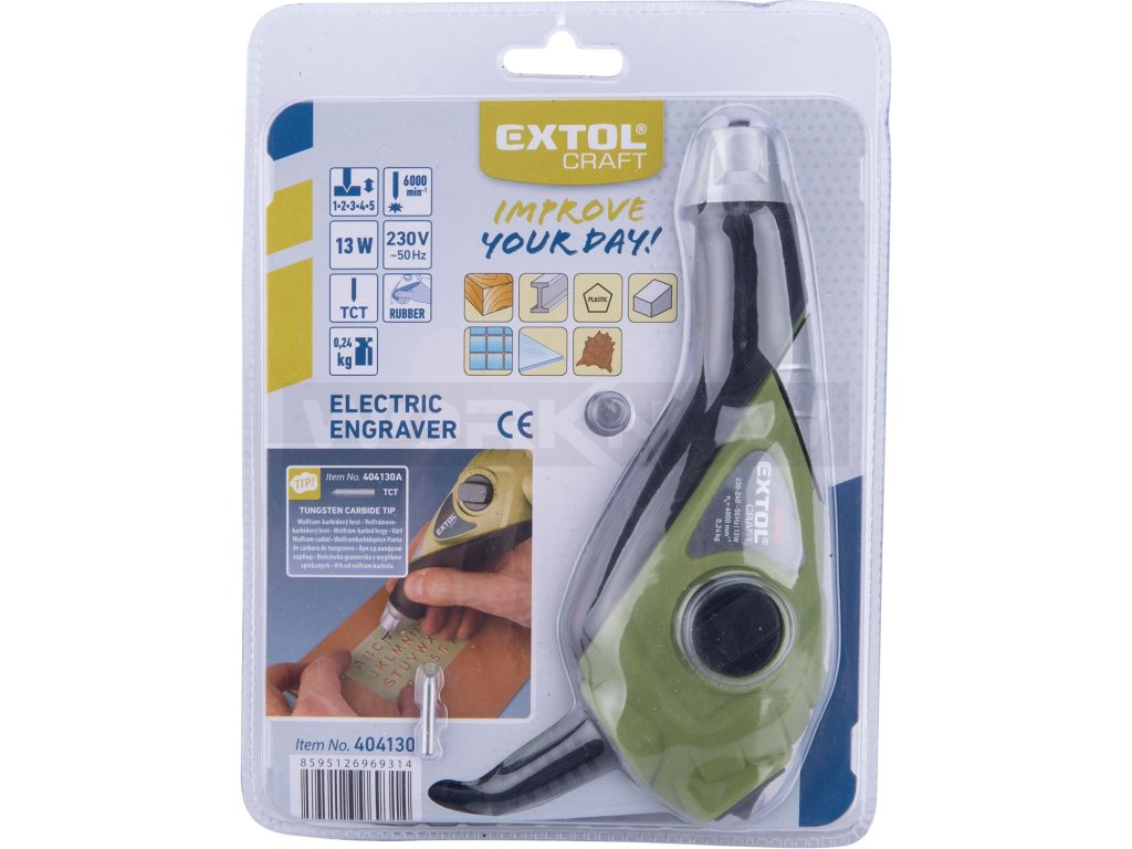 Info: kadence úderů 6000/min, gravírovací hrot - karbid wolframu, pro materiály do tvrdosti 58 HRC (dřevo, sklo, plast, měkké kovy, oc