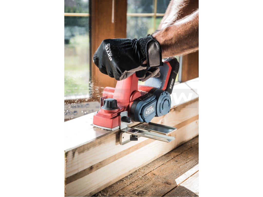 Aku hoblík Extol Premium kombinuje rychlost a výkonnost elektrického hoblíku s pohodlím akumulátorového nářadí. Výsledkem je rychlé a přesné odebrání materiálu bez překážejícího kabelu. Řezná hlava hoblíku má dva kvalitní břity. Ochranný trn v pracovní desce hoblíku chrání čepel i obráběný materiál tím, že udržuje čepel zvednutou a mimo kontakt s povrchem vašeho materiálu mezi řezy. Sběrný vak připojený na prachový výstup pomáhá udržovat pracovní prostor čistý a bez pilin. Přiložený adaptér pro falcování pomáhá vytvářet polodrážky ve vašich deskách a paralelní adaptér udržuje hoblík v nastavené vzdálenosti. Pro běžnou práci dostačují jeden nebo dva 2000mAh akumulátory, které můžete rychle nabít v rychlonabíječce, pro náročnější nebo delší práci doporučujeme větší akumulátory s kapacitou 4000–8000mAh. Akumulátor lze použít ve všech typech nářadí řady EXTOL SHARE20V. Díky použité Li-ion technologii je ho možné kdykoliv dobíjet, aniž by se tím snižovala jeho kapacita. Li-ion akumulátor ztrácí energii vlivem samovybíjení velmi pomalu a vydrží dlouho nabitý a připravený k použití.- hoblík je vybaven integrovaným systémem odsáváním pilin a třísek do sběrného vaku