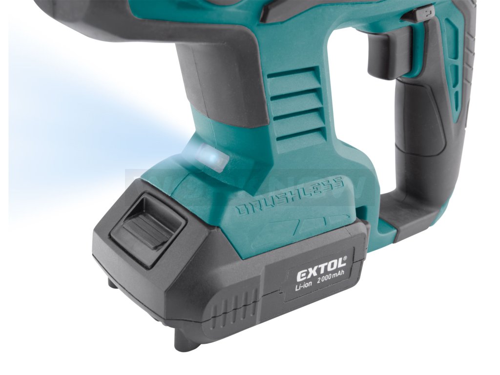 Aku vrtací kladivo je určeno k rychlému vrtání do cihel a betonu pomocí vrtáků s SDS plus stopkou a menším sekacím pracem. Kladivo je poháněno nejmodernějším „brushless" motorem. Tento nový typ motoru má vyšší životnost, je výkonnější a má menší spotřebu el. energie než klasické motory s uhlíkovými kartáči. Díky pneumatickému příklepovému systému je schopno vrtat mnohem rychleji a efektivněji než příklepové vrtačky. Kladivo má zámek sekáče, takže si můžete před sekáním sekáč nastavit do patřičné polohy a při sekání bude kladivo udržovat sekáč v této poloze. Jeho hlavní výhodou je akumulátorový pohon, který dovoluje si vzít kladivo s sebou tam kde s ním potřebujete pracovat, bez ohledu na to, jestli tam je rozvod elektrické energie. Kladivo je vybaveno zpětným chodem pro snadné vytažení zaseklého vrtáku a regulací rychlosti, kterou lze využít dle vrtaného materiálu. Integrované LED osvětlení má zpožděné vypnutí a svítí ještě několik vteřin po vypnutí kladiva. Pro běžnou práci dostačují jeden nebo dva 2000mAh akumulátory, které můžete rychle nabít v rychlonabíječce, pro náročnější nebo delší práci doporučujeme větší akumulátory s kapacitou 4000–8000mAh. Akumulátor lze použít ve všech typech nářadí řady EXTOL SHARE20V. Díky použité Li-ion technologii je ho možné kdykoliv dobíjet, aniž by se tím snižovala jeho kapacita. Li-ion akumulátor ztrácí energii vlivem samovybíjení velmi pomalu a vydrží dlouho nabitý a připravený k použití.- pneumatický příklep pro rychlé vrtání