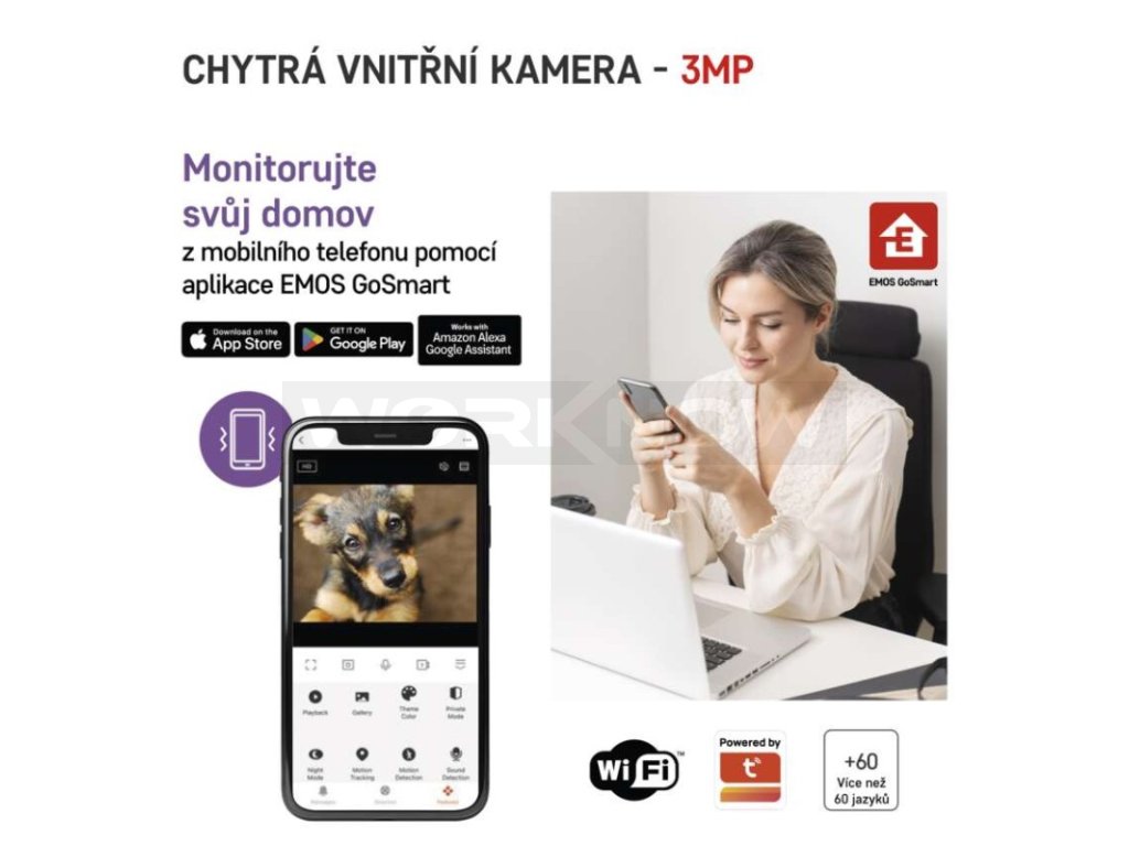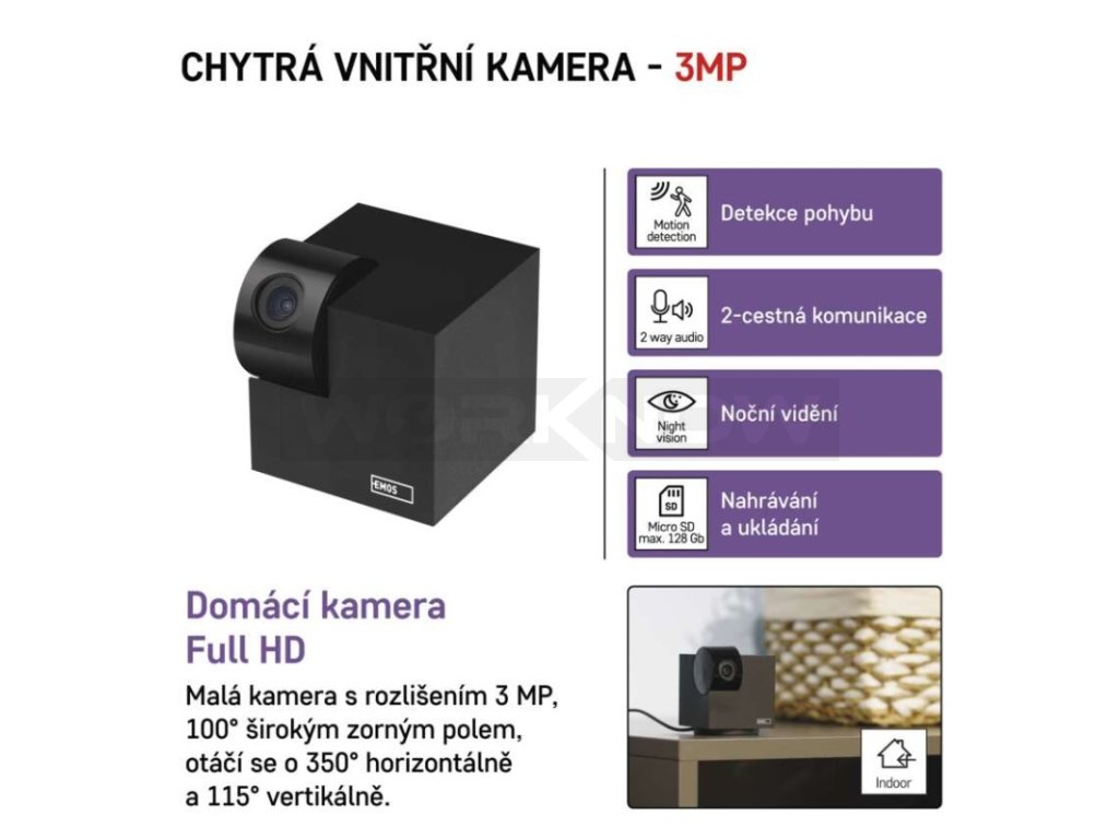 Kamera se napájí pomocí USB kabelu z elektrické sítě nebo z powerbanky. Po připojení k domácí Wi-Fi síti a spárování s aplikací EMOS GoSmart pro Android a iOS je kamera připravena k použití.