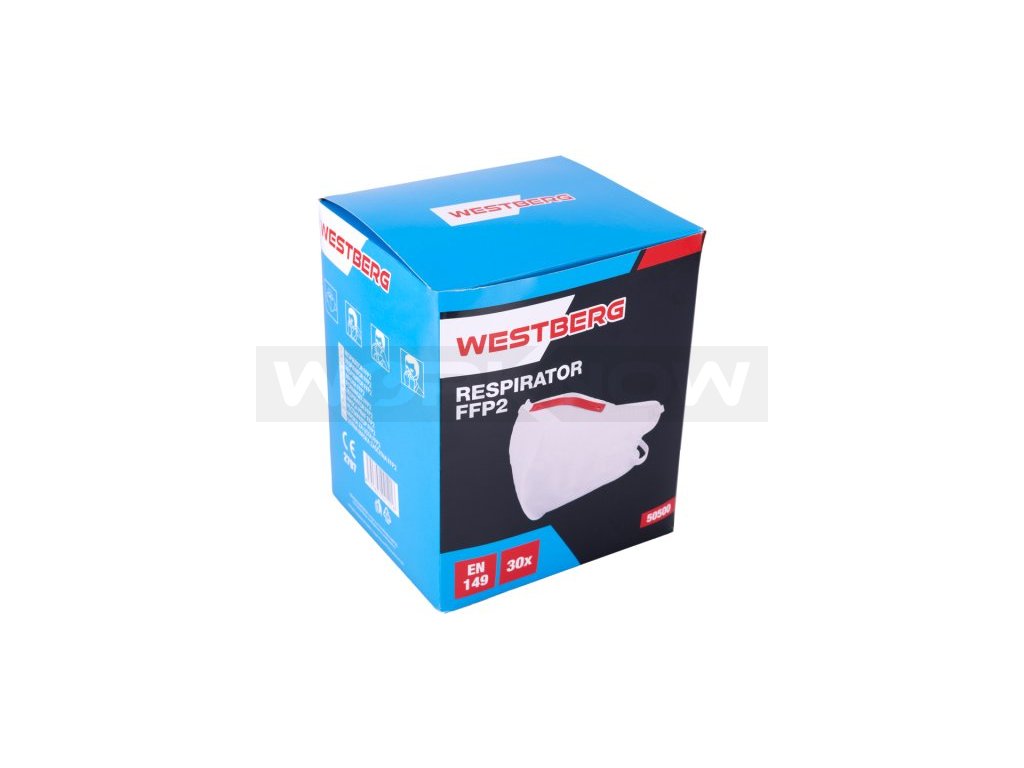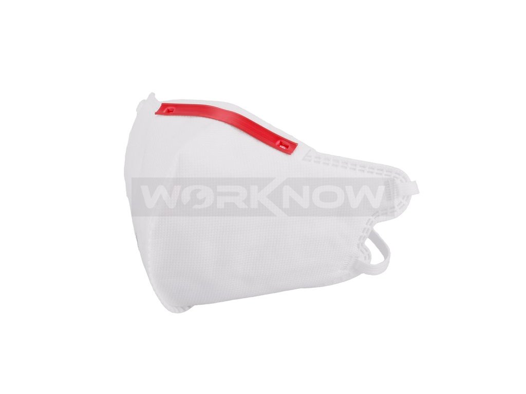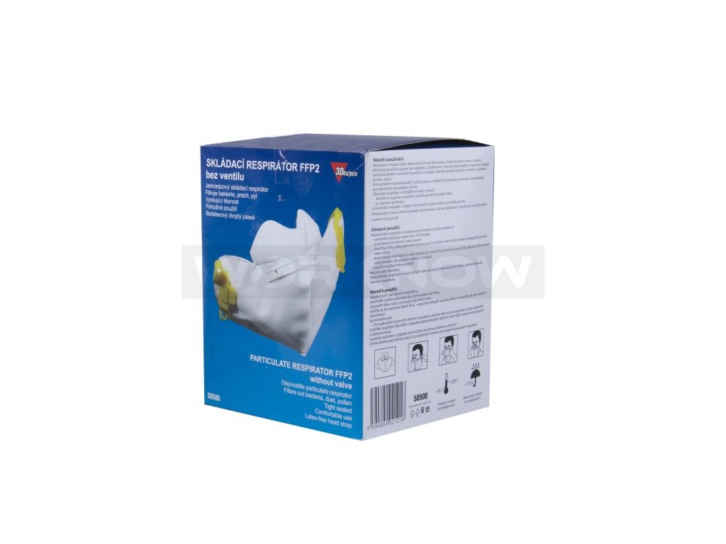 Skládaný respirátor, filtrační médium z polypropylenu, nastavitelná nosní svěrka, nastavitelná délka pomocí dvojitého gumového pásku, měkká nosní pěna, FFP2, CE EN 149.Dodatočné parametre