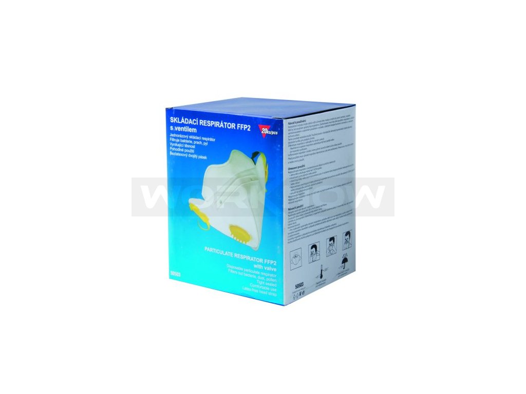Skládaný respirátor s výdechovým ventilkem, filtrační médium z polypropylenu, nastavitelná nosní svěrka, nastavitelná délka pomocí dvojitého gumového pásku, měkká nosní pěna, FFP2, CE EN 149.Dodatočné parametre