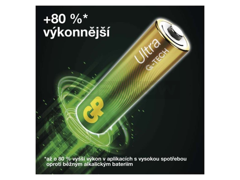 Představujeme vám nejnovější řadu alkalických baterií ULTRA, která je vybavena revoluční technologií G-TECH. Tato inovativní technologie poskytuje bateriím až o 80 % vyšší výkon než mají běžné alkalické baterie na trhu.