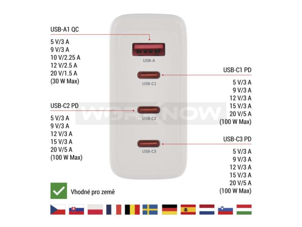 | Max. výstup 1× USB: | A: 5 V/3 A – 9 V/3 A – 10 V/2,25 A – 12 V/2,5 A – 20 V/1,5 A (30 W); C1/C2/C3: 5 V/3 A – 9 V/3 A – 12 V/3 A – 15 V/3 A – 20 V/5 |