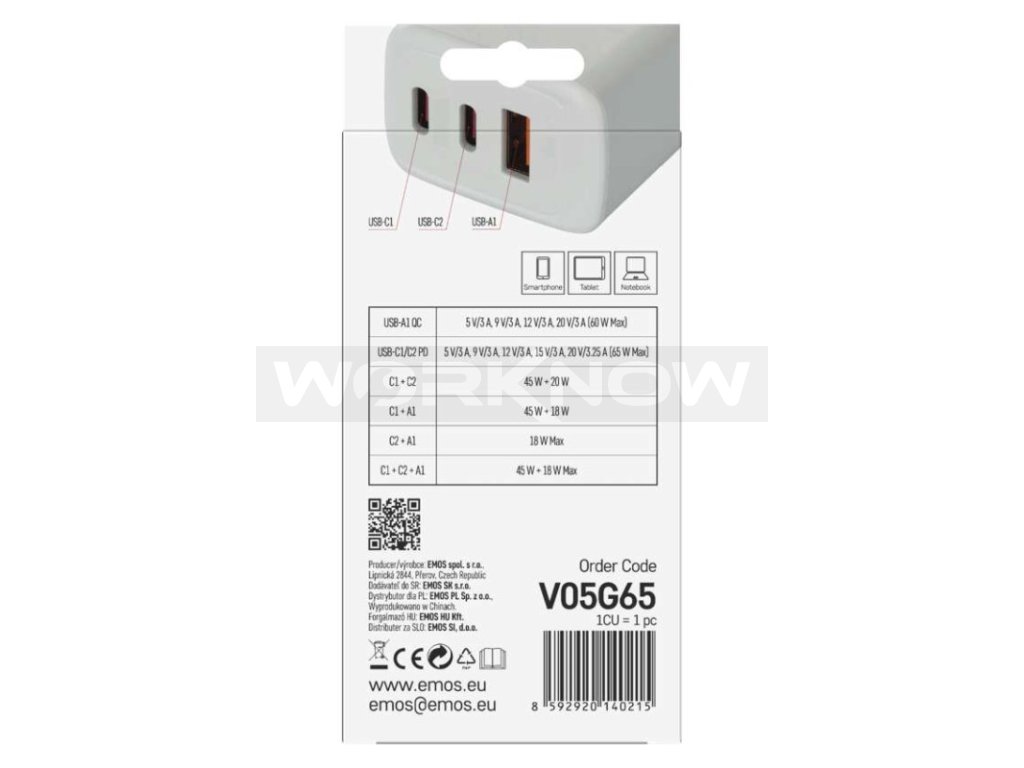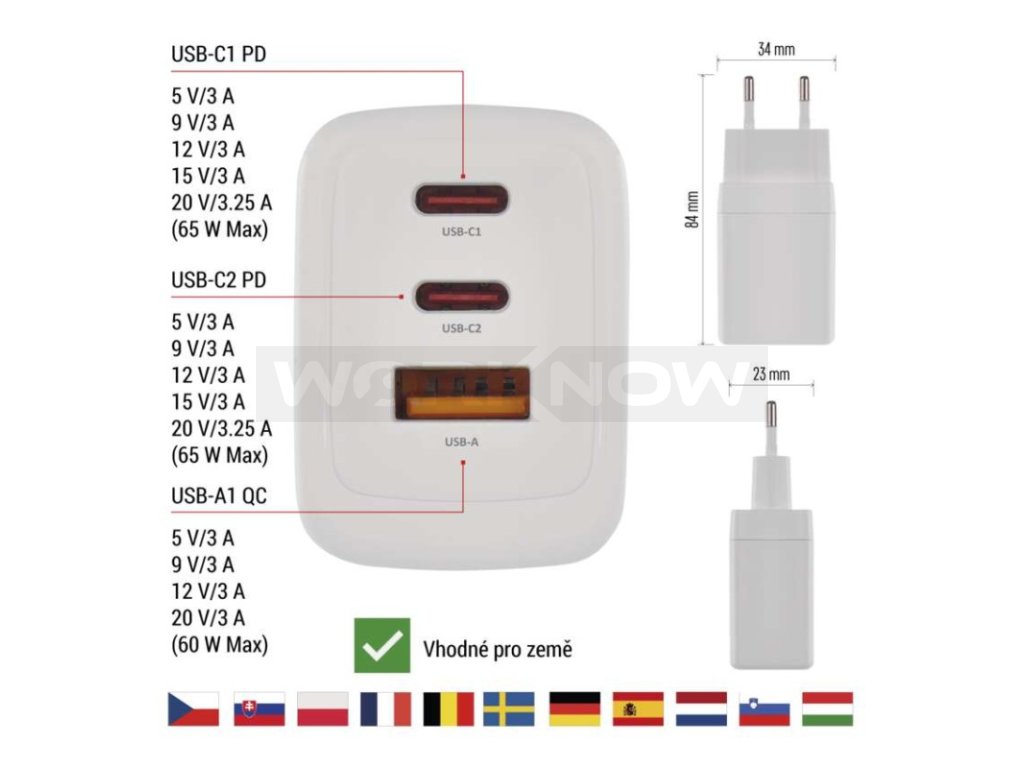 | Max. výstup 1× USB: | A: 5 V/3 A - 9 V/3 A - 12 V/3 A - 20 V/3 A (60 W); C1/C2: 5 V/3 A – 9 V/3 A – 12 V/3 A – 15 V/3 A – 20 V/3,25 A (65 W) |