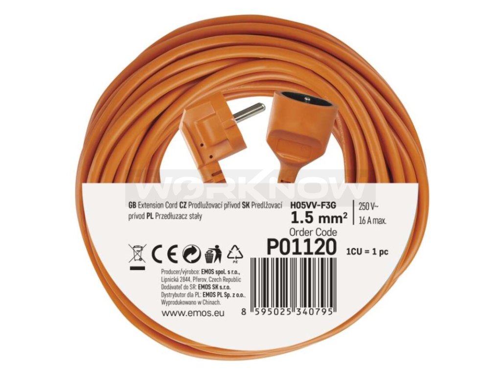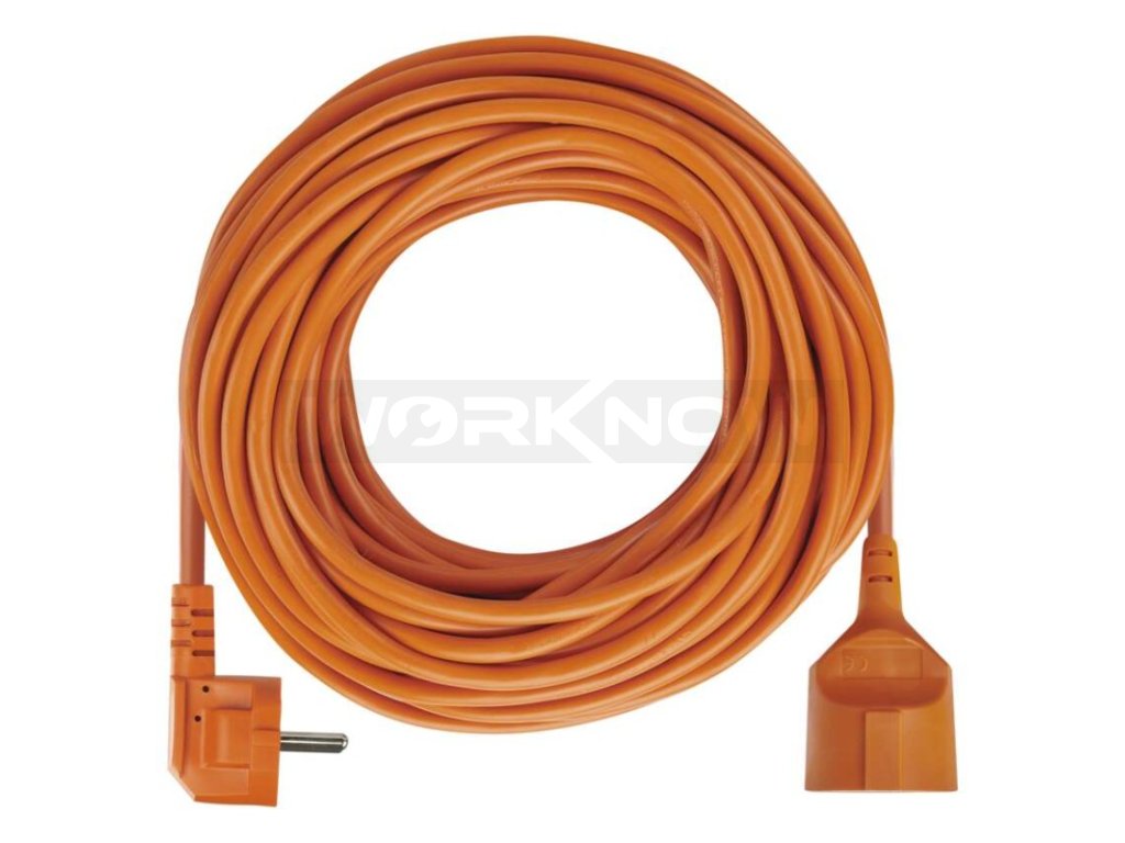 Oranžový prodlužovací přívod s jednou zásuvkou - spojka, délkou 20 m a průřezem vodiče 1,5 mm2. Vhodný pro maximální zátěž 16 A max. Prodlužovací přívod 20 m na 230 V~ slouží k prodloužení elektrické energie tam, kam pevná zásuvka nedosáhne.