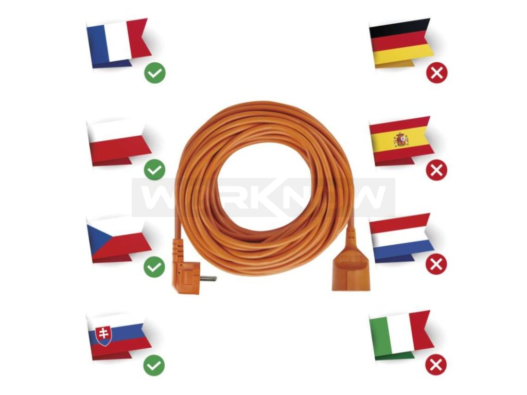 Oranžový prodlužovací přívod s jednou zásuvkou - spojka, délkou 20 m a průřezem vodiče 1,5 mm2. Vhodný pro maximální zátěž 16 A max.
