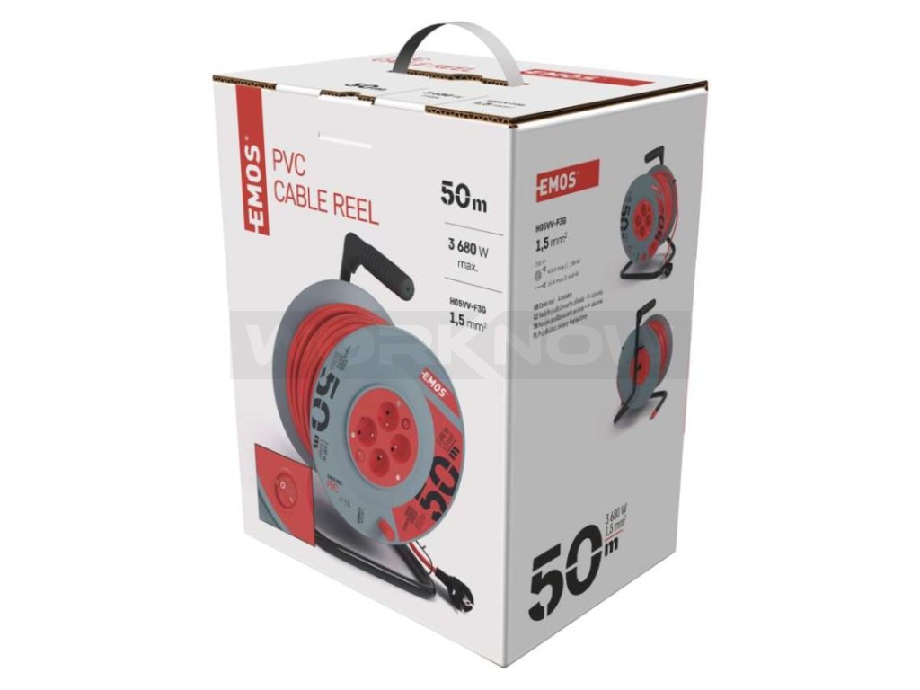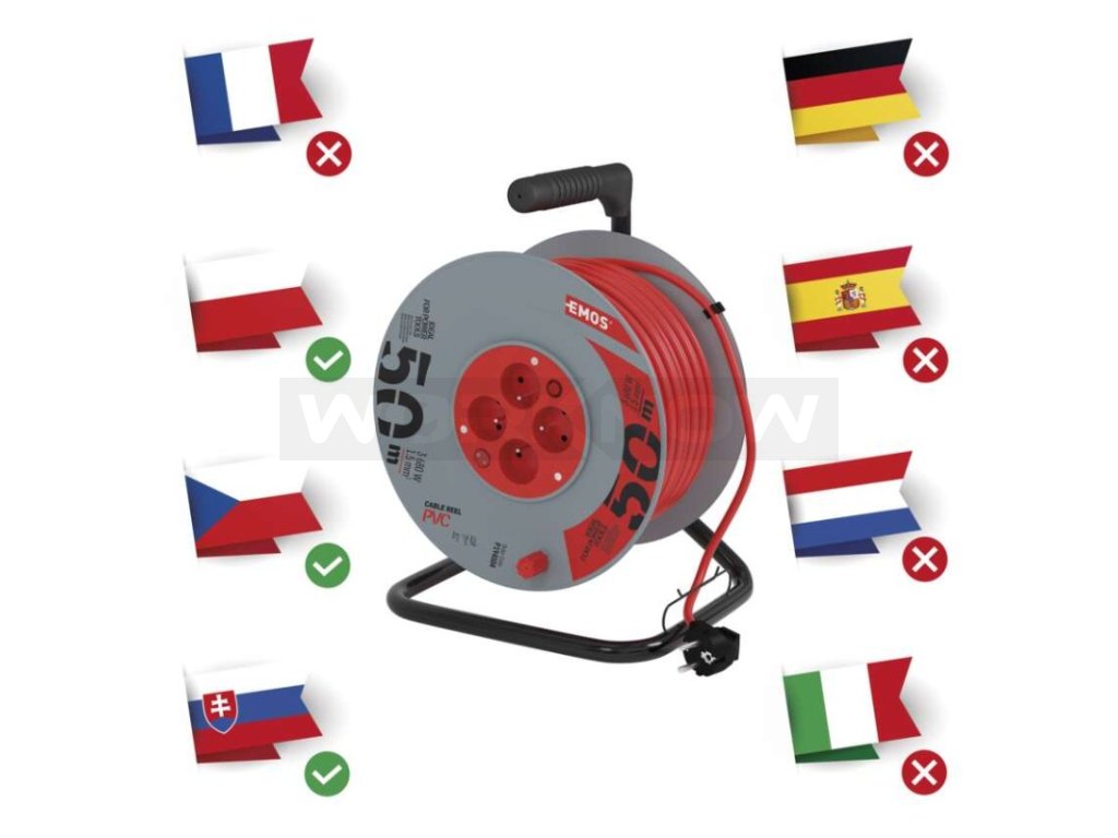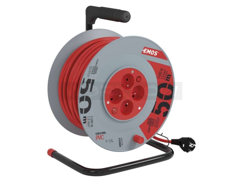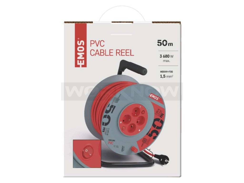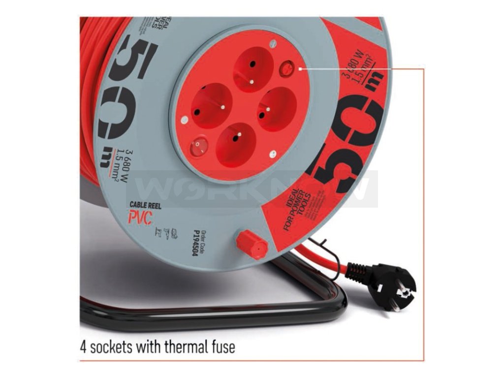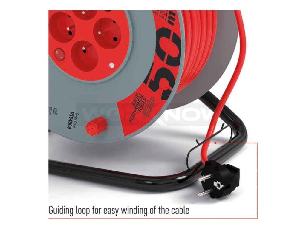 Prodlužovací kabel na bubnu 50 m / 4 zás. / s vypínačem / červený / PVC / 230V / 1,5 mm2 P194504