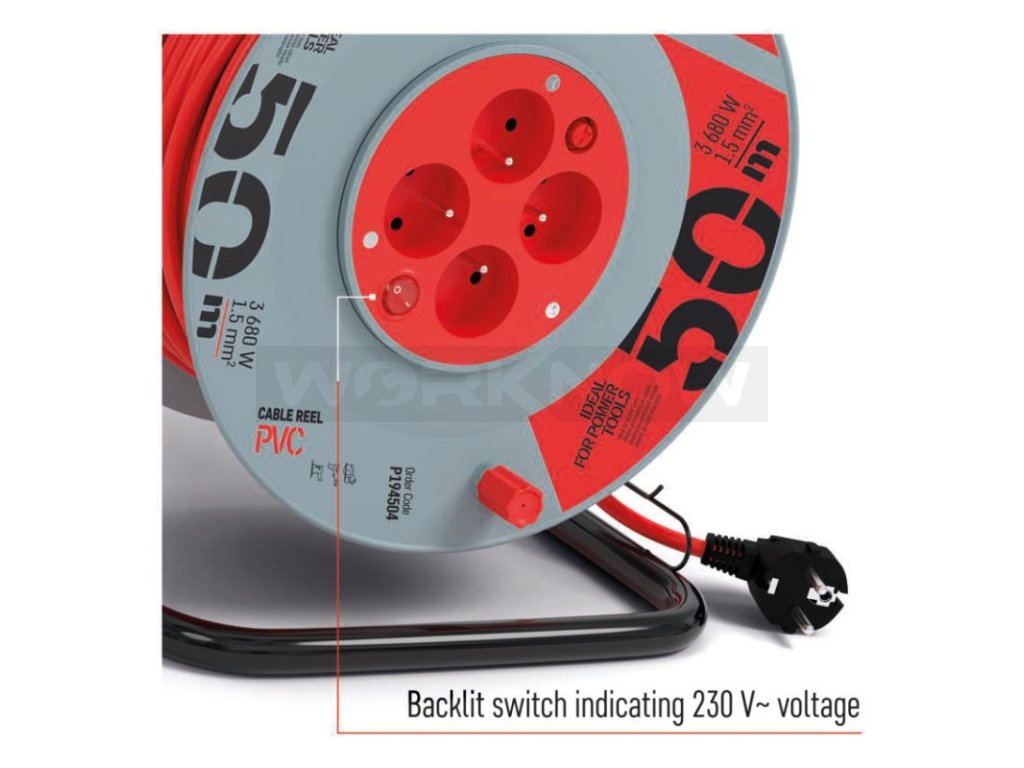 Vodící oko pro snadné navíjení kabelu. Zabraňuje spadnutí kabelu při navíjení z cívky navijáku. Podsvícený vypínač, který signalizuje napětí 230 V~.