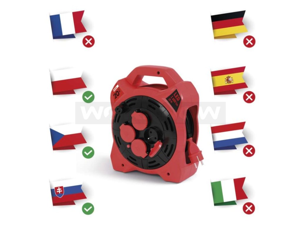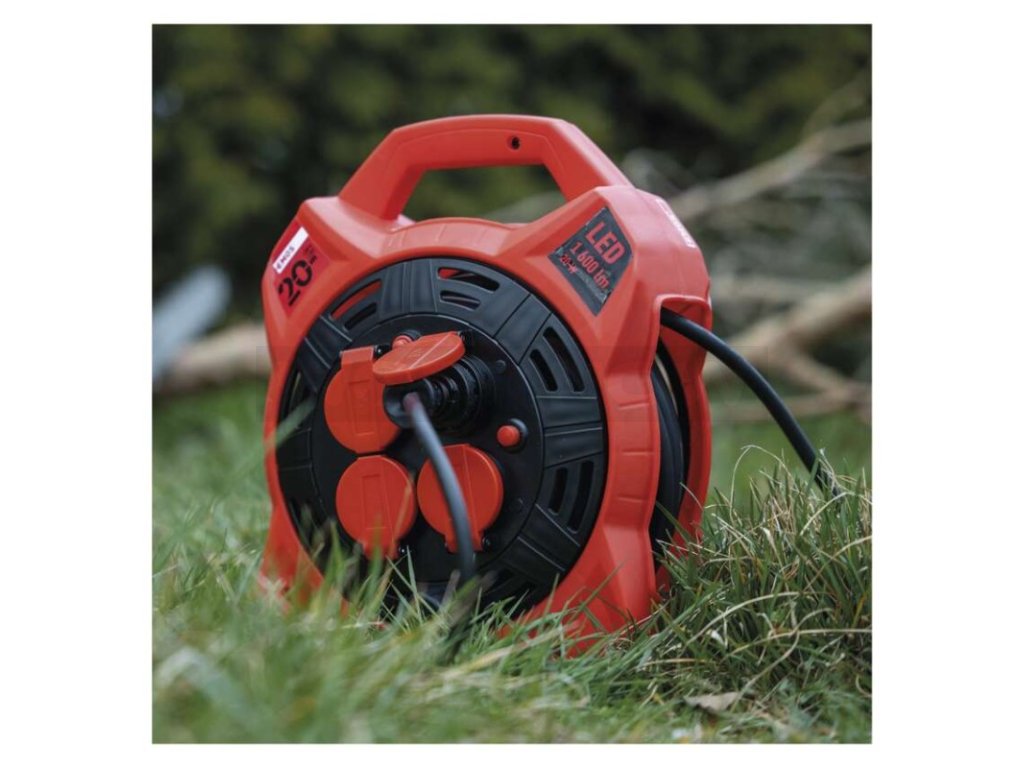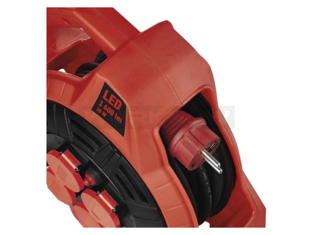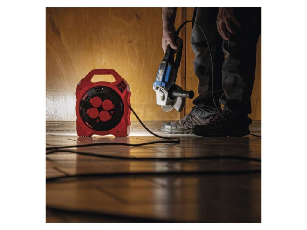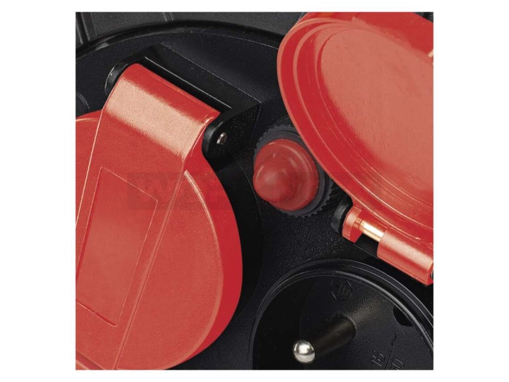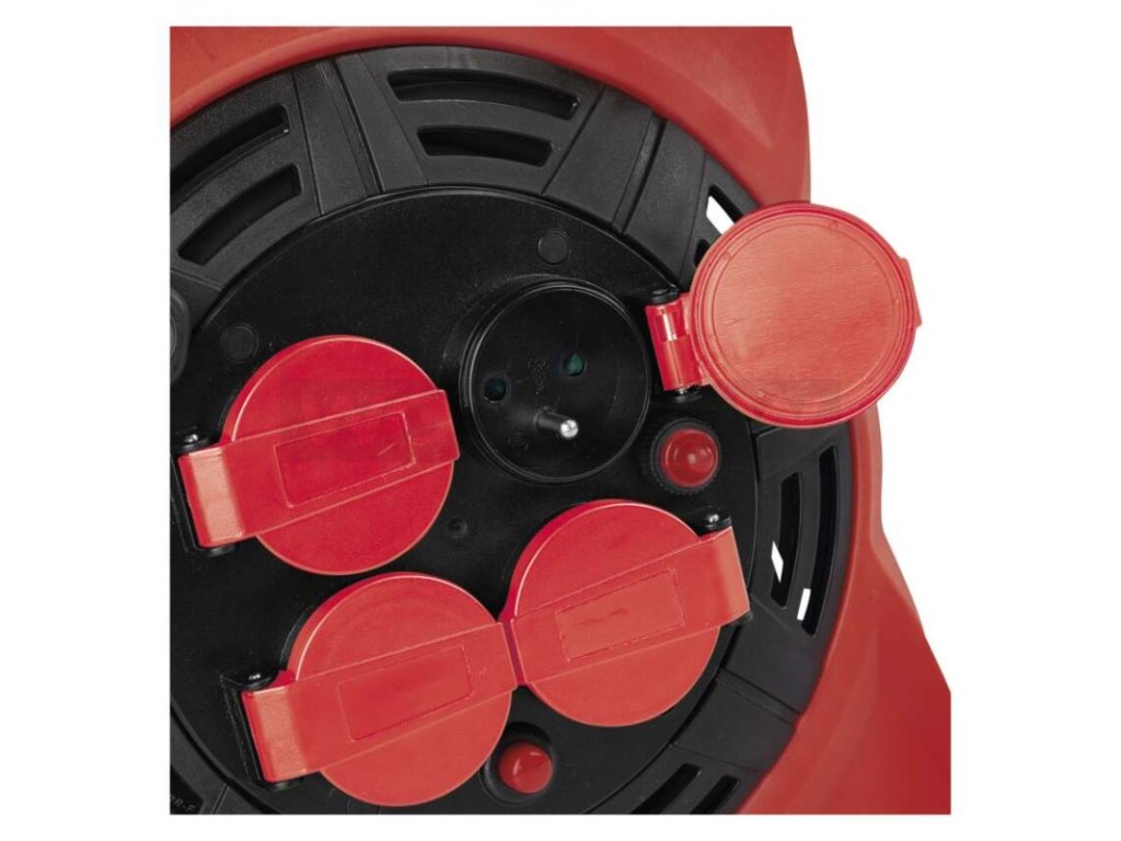 Naviják prodlužovacího kabelu s LED reflektorem umožňuje zapojení až 4 elektro zařízení současně. Zásuvky odpovídají napětí 230 V~. Tento profesionální prodlužovací kabel je vybaven tepelnou pojistkou, která bezpečně ochrání všechny vaše zařízení před přehřátím. Pokud se teplota prodlužovacího kabelu uvnitř bubnu dostane nad stanovenou mez tepelné pojistky, obvod se okamžitě přeruší. Díky této pojistce nedojde k poškození zařízení a vás ochrání před nebezpečným úrazem.