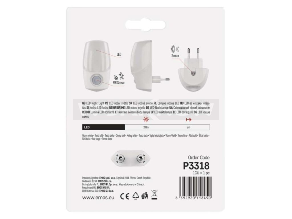 Tmy se již není třeba obávat díky nočnímu světlu EMOS P3318. Jednoduše ho připojíte do zásuvky a světelný senzor (day/night senzor) se sám automaticky postará o jeho aktivaci dle intenzity okolního světla. Model je vybaven PIR čidlem pohybu, který rozsvítí světlo jen když je potřeba. Malé rozměry a jednoduchý nadčasový design z něj pak dělají praktického pomocníka do každé domácnosti.