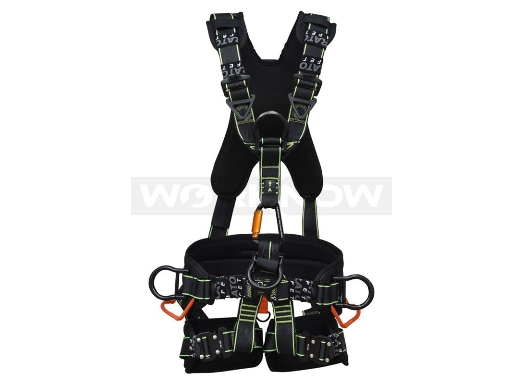 - upevňovací body - 1 zádový D-kroužek a 1 hrudní D-kroužek pro zachycení pádu, 1 ventrální D-kroužek v úrovni pasu pro lanový přístup, 2 boční D-kroužky v úrovni pasu pro pracovní polohování