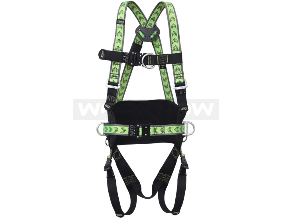 - prvky upevnění – 1 hrudní D-kroužek a dorzální D-kroužek pro zajištění proti pádu, 2 boční D-kroužky pro pracovní polohování