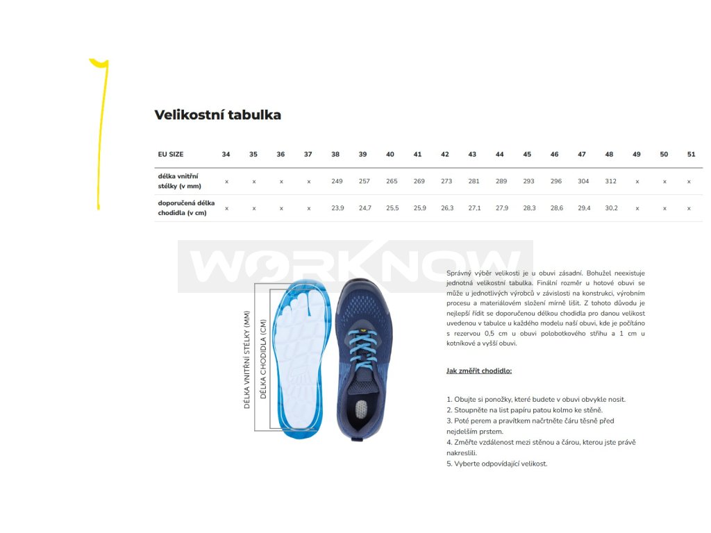 Správný výběr velikosti je u obuvi zásadní. Bohužel neexistuje jednotná velikostní tabulka. Finální rozměr u hotové obuvi se může u jednotlivých výrobců v závislosti na konstrukci, výrobním procesu a materiálovém složení mírně lišit. Z tohoto důvodu je nejlepší řídit se doporučenou délkou chodidla pro danou velikost uvedenou v tabulce u každého modelu naší obuvi, kde je počítáno s rezervou 0,5 cm u obuvi polobotkového střihu a 1 cm u kotníkové a vyšší obuvi.