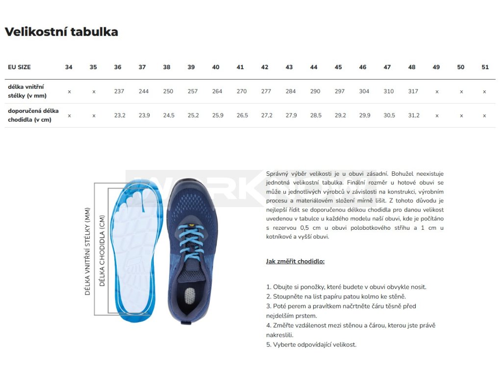 Správný výběr velikosti je u obuvi zásadní. Bohužel neexistuje jednotná velikostní tabulka. Finální rozměr u hotové obuvi se může u jednotlivých výrobců v závislosti na konstrukci, výrobním procesu a materiálovém složení mírně lišit. Z tohoto důvodu je nejlepší řídit se doporučenou délkou chodidla pro danou velikost uvedenou v tabulce u každého modelu naší obuvi, kde je počítáno s rezervou 0,5 cm u obuvi polobotkového střihu a 1 cm u kotníkové a vyšší obuvi.