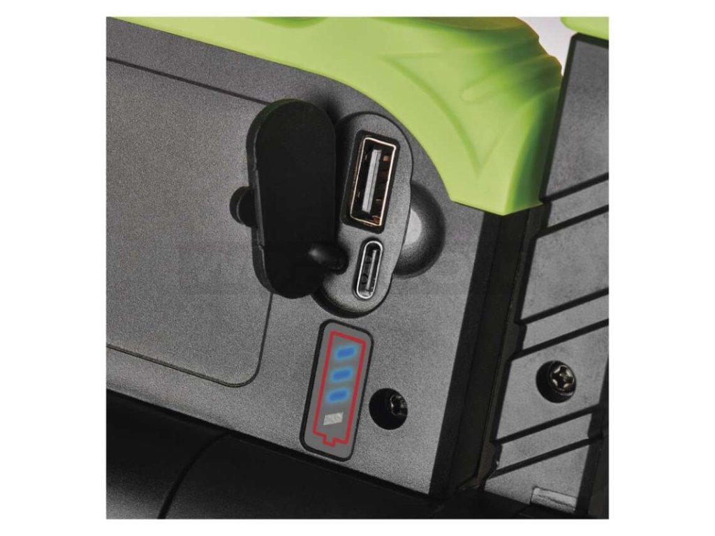 Na zadní straně reflektoru se ukrývá malé odklápěcí okénko. Pod ním najdete dva bezpečně ukryté USB porty. Pomocí toho menšího (USB-C) reflektor snadno nabijete, ten větší (USB-A) vám naopak umožní využít reflektor jako powerbanku. V případě nouze si tak z reflektoru můžete třeba nabít mobil. O aktuálním stavu nabíjení i zbývajícím množství energie v reflektoru vás průběžně informují 4 barevné LED diody.